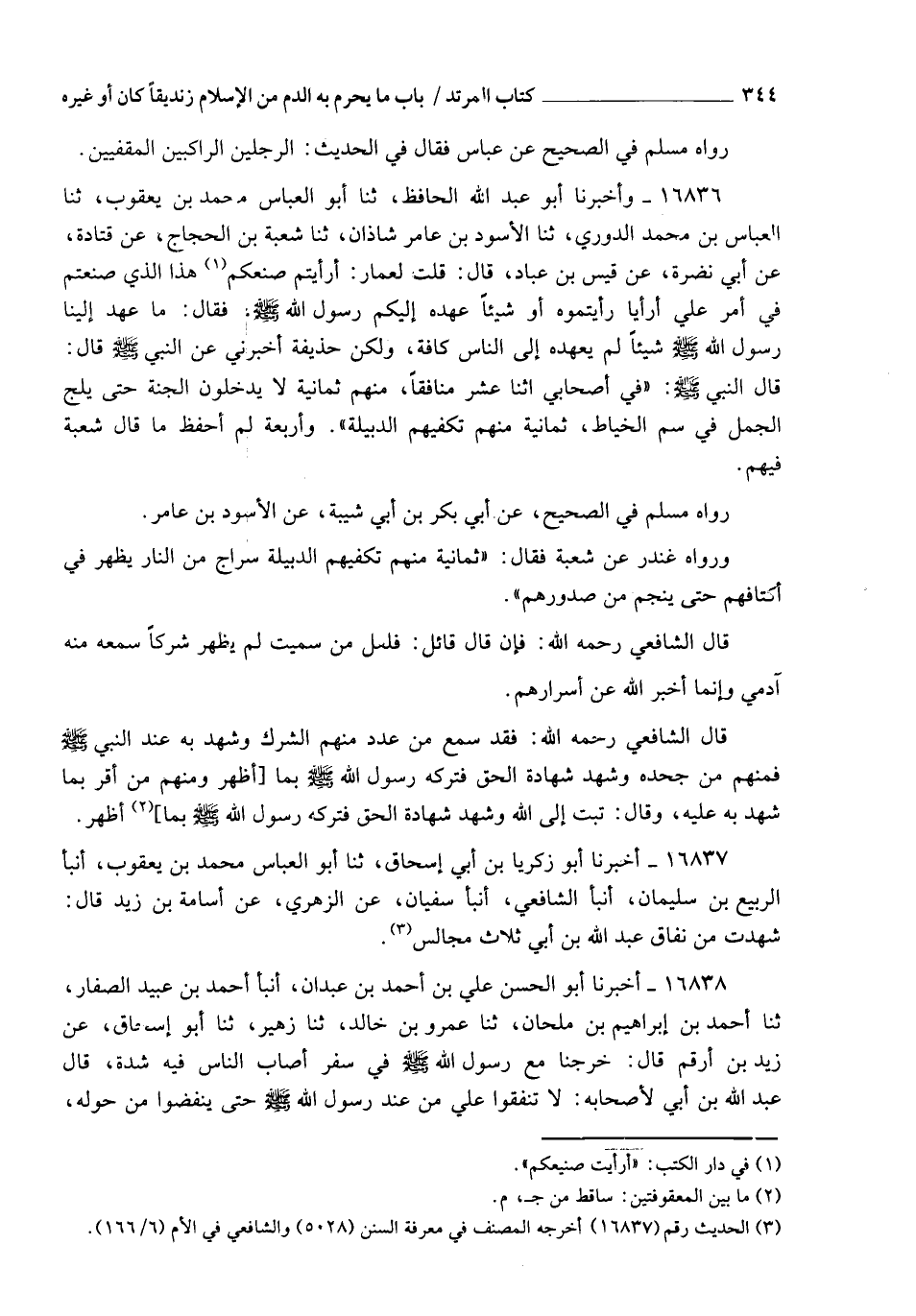 16837 - أَخْبَرَنَا أَبُو زَكَرِيَّا بْنُ أَبِي إِسْحَاقَ، ثنا أَبُو الْعَبَّاسِ مُحَمَّدُ بْنُ يَعْقُوبَ، أنبأ الرَّبِيعُ بْنُ سُلَيْمَانَ، أنبأ الشَّافِعِيُّ، أنبأ سُفْيَانُ، عَنِ الزُّهْرِيِّ، عَنْ أُسَامَةَ بْنِ زَيْدٍ، قَالَ: §" شَهِدْتُ مِنْ نِفَاقِ عَبْدِ اللهِ بْنِ أُبَيٍّ ثَلَاثَ مَجَالِسَ "