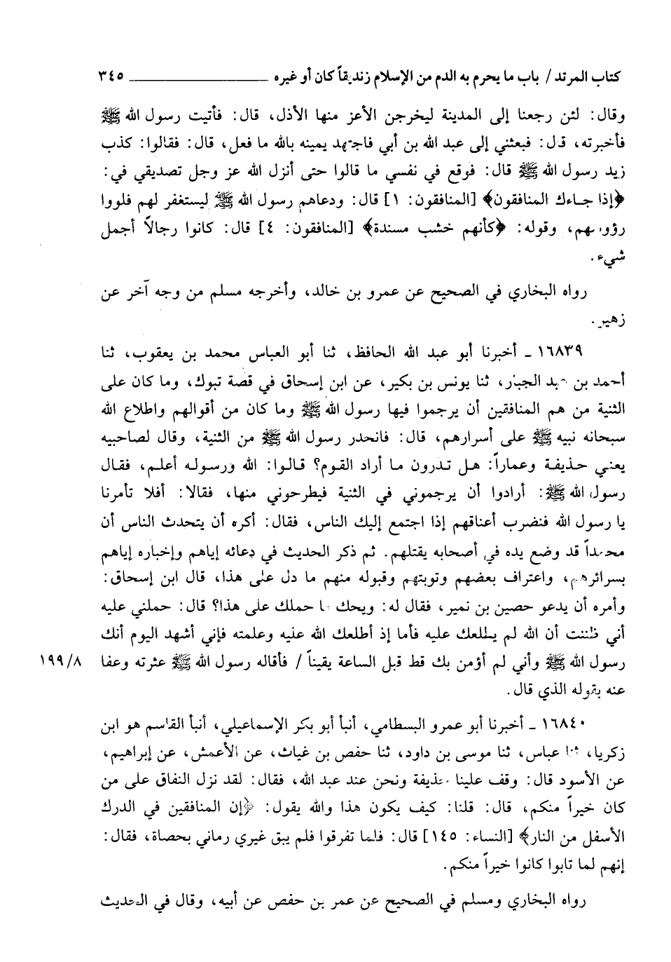 16839 - أَخْبَرَنَا أَبُو عَبْدِ اللهِ الْحَافِظُ، ثنا أَبُو الْعَبَّاسِ مُحَمَّدُ بْنُ يَعْقُوبَ، ثنا أَحْمَدُ بْنُ عَبْدِ الْجَبَّارِ، ثنا يُونُسُ بْنُ بُكَيْرٍ، عَنِ ابْنِ إِسْحَاقَ، فِي قِصَّةِ تَبُوكَ، وَمَا كَانَ عَلَى الثَّنِيَّةِ مِنْ هَمِّ الْمُنَافِقِينَ أَنْ يَرْجُمُوا فِيهَا رَسُولَ اللهِ صَلَّى اللهُ عَلَيْهِ وَسَلَّمَ، وَمَا كَانَ مِنْ أَقْوَالِهِمْ وَإِطْلَاعِ اللهِ سُبْحَانَهُ نَبِيَّهُ صَلَّى اللهُ عَلَيْهِ وَسَلَّمَ عَلَى أَسْرَارِهِمْ، قَالَ: فَانْحَدَرَ رَسُولُ اللهِ صَلَّى اللهُ عَلَيْهِ وَسَلَّمَ مِنَ الثَّنِيَّةِ وَقَالَ لِصَاحِبَيْهِ، يَعْنِي حُذَيْفَةَ وَعَمَّارًا: " هَلْ تَدْرُونَ مَا أَرَادَ الْقَوْمُ؟ " قَالُوا: اللهُ وَرَسُولُهُ أَعْلَمُ، فَقَالَ رَسُولُ اللهِ صَلَّى اللهُ عَلَيْهِ وَسَلَّمَ: " §أَرَادُوا أَنْ يَرْجُمُونِي فِي الثَّنِيَّةِ، فَيَطْرَحُونِي مِنْهَا " فَقَالَا: أَفَلَا تَأْمُرُنَا يَا رَسُولَ اللهِ فَنَضْرِبَ أَعْنَاقَهُمْ إِذَا اجْتَمَعَ إِلَيْكَ النَّاسُ؟ فَقَالَ: " أَكْرَهُ أَنْ يَتَحَدَّثَ النَّاسُ أَنَّ مُحَمَّدًا قَدْ وَضَعَ يَدَهُ فِي أَصْحَابِهِ يَقْتُلُهُمْ " ثُمَّ ذَكَرَ الْحَدِيثَ فِي دُعَائِهِ إِيَّاهُمْ، وَإِخْبَارِهِ إِيَّاهُمْ بِسَرَائِرِهِمْ، وَاعْتِرَافِ بَعْضِهِمْ وَتَوْبَتِهِمْ، وَقَبُولِهِ مِنْهُمْ مَا دَلَّ عَلَى هَذَا قَالَ ابْنُ إِسْحَاقَ: وَأَمَرَهُ أَنْ يَدْعُوَ حُصَيْنَ بْنَ نُمَيْرٍ فَقَالَ لَهُ: " وَيْحَكَ مَا حَمَلَكَ عَلَى هَذَا؟ " قَالَ: حَمَلَنِي عَلَيْهِ أَنِّي ظَنَنْتُ أَنَّ اللهَ لَمْ يُطْلِعْكَ عَلَيْهِ، فَأَمَّا إِذْ أَطْلَعْكَ اللهُ عَلَيْهِ وَعَلِمْتَهُ فَإِنِّي أَشْهَدُ الْيَوْمَ أَنَّكَ رَسُولُ اللهِ، وَأَنِّي لَمْ أُؤْمِنْ بِكَ قَطُّ قَبْلَ السَّاعَةِ يَقِينًا، فَأَقَالَهُ رَسُولُ اللهِ صَلَّى اللهُ عَلَيْهِ وَسَلَّمَ عَثْرَتَهُ، وَعَفَا عَنْهُ بِقَوْلِهِ الَّذِي قَالَ