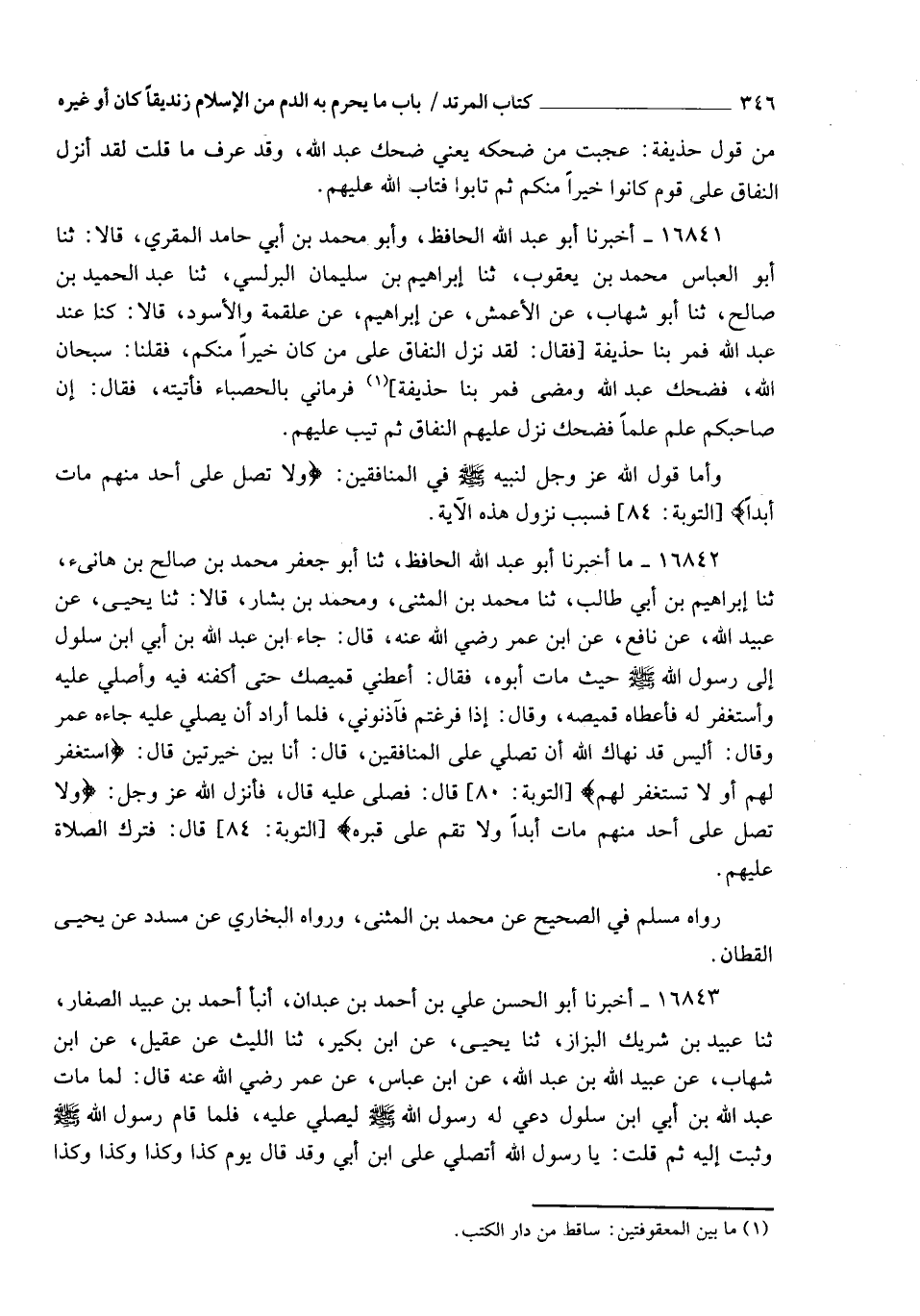 16841 - أَخْبَرَنَا أَبُو عَبْدِ اللهِ الْحَافِظُ، وَأَبُو مُحَمَّدِ بْنُ أَبِي حَامِدٍ الْمُقْرِئُ، قَالَا: ثنا أَبُو الْعَبَّاسِ مُحَمَّدُ بْنُ يَعْقُوبَ، ثنا إِبْرَاهِيمُ بْنُ سُلَيْمَانَ الْبُرُلُّسِيُّ، ثنا عَبْدُ الْحَمِيدِ بْنُ صَالِحٍ، ثنا أَبُو شِهَابٍ، عَنِ الْأَعْمَشِ، عَنْ إِبْرَاهِيمَ، عَنْ عَلْقَمَةَ، وَالْأَسْوَدِ، قَالَا: كُنَّا عِنْدَ عَبْدِ اللهِ فَمَرَّ بِنَا حُذَيْفَةُ فَقَالَ: §" لَقَدْ نَزَلَ النِّفَاقُ عَلَى مَنْ كَانَ خَيْرًا مِنْكُمْ " فَقُلْنَا: سُبْحَانَ اللهِ فَضَحِكَ عَبْدُ اللهِ وَمَضَى، فَمَرَّ بِنَا حُذَيْفَةُ فَرَمَانِي بِالْحَصْبَاءِ فَأَتَيْتُهُ، فَقَالَ: " إِنَّ صَاحِبَكُمْ عَلِمَ عِلْمًا فَضَحِكَ، نَزَلَ عَلَيْهِمُ النِّفَاقُ ثُمَّ تِيبَ عَلَيْهِمْ " وَأَمَّا قَوْلُ اللهِ عَزَّ وَجَلَّ لِنَبِيِّهِ صَلَّى اللهُ عَلَيْهِ وَسَلَّمَ فِي الْمُنَافِقِينَ: {وَلَا تُصَلِّ عَلَى أَحَدٍ مِنْهُمْ مَاتَ أَبَدًا} [التوبة: 84]، فَسَبَبُ نُزُولِ هَذِهِ الْآيَةِ