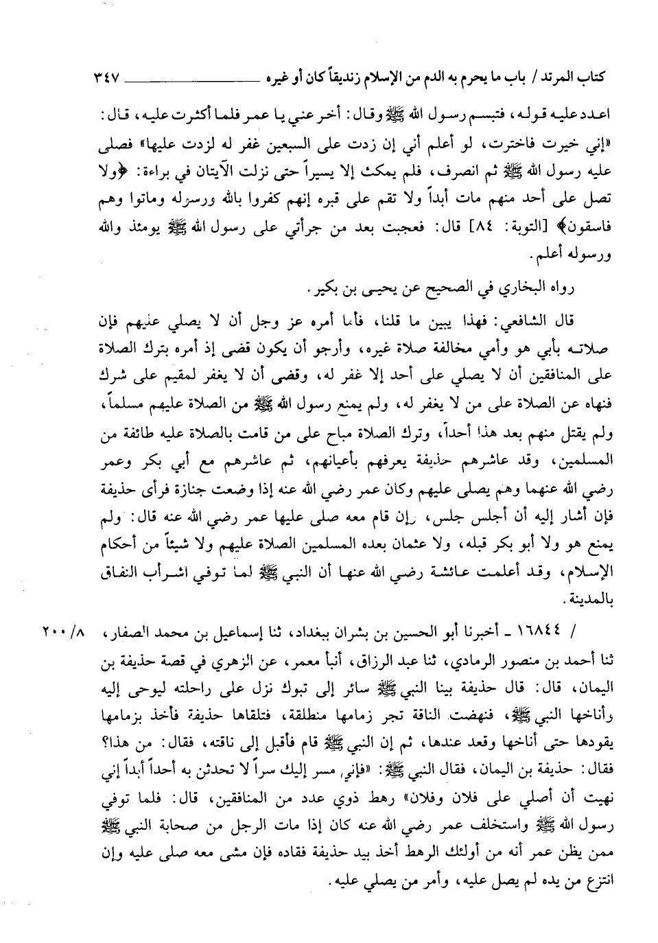 16844 - أَخْبَرَنَا أَبُو الْحُسَيْنِ بْنُ بِشْرَانَ، بِبَغْدَادَ، ثنا إِسْمَاعِيلُ بْنُ مُحَمَّدٍ الصَّفَّارُ، ثنا أَحْمَدُ بْنُ مَنْصُورٍ الرَّمَادِيُّ، ثنا عَبْدُ الرَّزَّاقِ، أنبأ مَعْمَرٌ، عَنِ الزُّهْرِيِّ، فِي قِصَّةِ حُذَيْفَةَ بْنِ الْيَمَانِ، قَالَ: قَالَ حُذَيْفَةُ: بَيْنَا النَّبِيُّ صَلَّى اللهُ عَلَيْهِ وَسَلَّمَ سَائِرٌ إِلَى تَبُوكَ نَزَلَ عَنْ رَاحِلَتِهِ لَيُوحَى إِلَيْهِ، وَأَنَاخَهَا النَّبِيُّ صَلَّى اللهُ عَلَيْهِ وَسَلَّمَ فَنَهَضَتِ النَّاقَةُ تَجُرُّ زِمَامَهَا مُنْطَلِقَةً، فَتَلَقَّاهَا حُذَيْفَةُ فَأَخَذَ بِزِمَامِهَا يَقُودُهَا حَتَّى أَنَاخَهَا وَقَعَدَ عِنْدَهَا، ثُمَّ إِنَّ النَّبِيَّ صَلَّى اللهُ عَلَيْهِ وَسَلَّمَ قَامَ فَأَقْبَلَ إِلَى نَاقَتِهِ فَقَالَ: " مَنْ هَذَا؟ " فَقَالَ: حُذَيْفَةُ بْنُ الْيَمَانِ، فَقَالَ النَّبِيُّ صَلَّى اللهُ عَلَيْهِ وَسَلَّمَ: " §فَإِنِّي مُسِرٌّ إِلَيْكَ سِرًّا لَا تُحَدِّثَنَّ بِهِ أَحَدًا أَبَدًا، إِنِّي نُهِيتُ أَنْ أُصَلِّيَ عَلَى فُلَانٍ وَفُلَانٍ "، رَهْطٍ ذَوِي عَدَدٍ مِنَ الْمُنَافِقِينَ، قَالَ: فَلَمَّا تُوُفِّيَ رَسُولُ اللهِ صَلَّى اللهُ عَلَيْهِ وَسَلَّمَ، وَاسْتُخْلِفَ عُمَرُ رَضِيَ اللهُ عَنْهُ، كَانَ إِذَا مَاتَ الرَّجُلُ مِنْ صَحَابَةِ النَّبِيِّ صَلَّى اللهُ عَلَيْهِ وَسَلَّمَ مِمَّنْ يَظُنُّ عُمَرُ أَنَّهُ مِنْ أُولَئِكِ الرَّهْطِ أَخَذَ بِيَدِ حُذَيْفَةَ فَقَادَهُ، فَإِنْ مَشَى مَعَهُ صَلَّى عَلَيْهِ، وَإِنِ انْتَزَعَ مِنْ يَدِهِ لَمْ يُصَلِّ عَلَيْهِ، وَأَمَرَ مَنْ يُصَلِّي عَلَيْهِ -[348]- هَذَا مُرْسَلٌ، وَقَدْ رُوِيَ مَوْصُولًا مِنْ وَجْهٍ آخَرَ