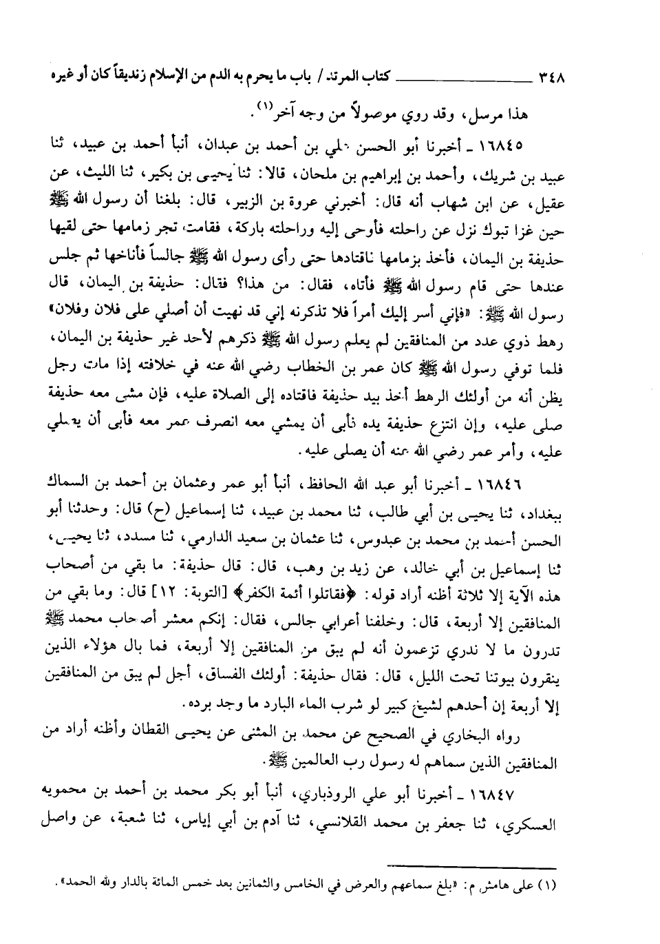 16846 - أَخْبَرَنَا أَبُو عَبْدِ اللهِ الْحَافِظُ، أنبأ أَبُو عُمَرَ، وَعُثْمَانُ بْنُ أَحْمَدَ بْنِ السَّمَّاكِ، بِبَغْدَادَ، ثنا يَحْيَى بْنُ أَبِي طَالِبٍ، ثنا مُحَمَّدُ بْنُ عُبَيْدٍ، ثنا إِسْمَاعِيلُ، ح قَالَ: وَحَدَّثَنَا أَبُو الْحَسَنِ أَحْمَدُ بْنُ مُحَمَّدِ بْنِ عُبْدُوسٍ، ثنا عُثْمَانُ بْنُ سَعِيدٍ الدَّارِمِيُّ، ثنا مُسَدَّدٌ، ثنا يَحْيَى، ثنا إِسْمَاعِيلُ بْنُ أَبِي خَالِدٍ، عَنْ زَيْدِ بْنِ وَهْبٍ، قَالَ: قَالَ حُذَيْفَةُ: §" مَا بَقِيَ مِنْ أَصْحَابِ هَذِهِ الْآيَةِ إِلَّا ثَلَاثَةٌ " أَظُنُّهُ أَرَادَ قَوْلَهُ: {فَقَاتِلُوا أَئِمَّةَ الْكُفْرِ} [التوبة: 12]، قَالَ: " وَمَا بَقِيَ مِنَ الْمُنَافِقِينَ إِلَّا أَرْبَعَةٌ " قَالَ: وَخَلْفَنَا أَعْرَابِيٌّ جَالِسٌ، فَقَالَ: إِنَّكُمْ مَعْشَرَ أَصْحَابِ مُحَمَّدٍ صَلَّى اللهُ عَلَيْهِ وَسَلَّمَ تَدْرُونَ مَا لَا نَدْرِي، تَزْعُمُونَ أَنَّهُ لَمْ يَبْقَ مِنَ الْمُنَافِقِينَ إِلَّا أَرْبَعَةٌ، فَمَا بَالُ هَؤُلَاءِ الَّذِينَ يَنْقُرُونَ بُيُوتَنَا تَحْتَ اللَّيْلِ؟ قَالَ: فَقَالَ حُذَيْفَةُ: أُولَئِكَ الْفُسَّاقُ، أَجَلْ لَمْ يَبْقَ مِنَ الْمُنَافِقِينَ إِلَّا أَرْبَعَةٌ، إِنَّ أَحَدَهُمْ لَشَيْخٌ كَبِيرٌ لَوْ شَرِبَ الْمَاءَ الْبَارِدَ مَا وَجَدَ بَرْدَهُ رَوَاهُ الْبُخَارِيُّ فِي الصَّحِيحِ عَنْ مُحَمَّدِ بْنِ الْمُثَنَّى، عَنْ يَحْيَى الْقَطَّانِ، وَأَظُنُّهُ أَرَادَ مِنَ الْمُنَافِقِينَ الَّذِينَ سَمَّاهُمْ لَهُ رَسُولُ رَبِّ الْعَالَمِينَ صَلَّى اللهُ عَلَيْهِ وَسَلَّمَ