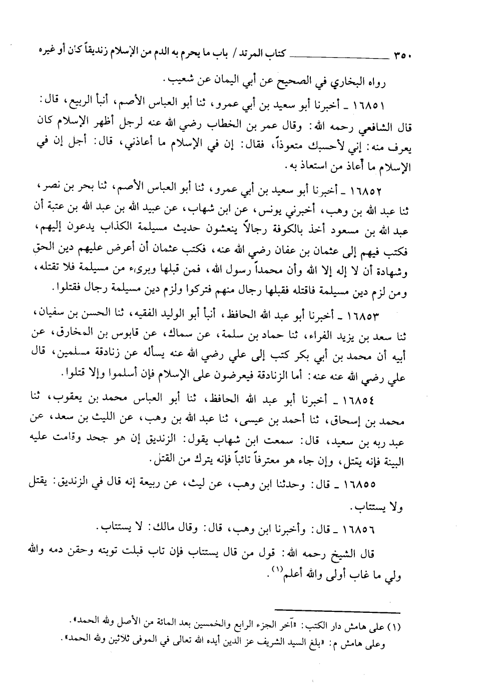 16852 - أَخْبَرَنَا أَبُو سَعِيدِ بْنُ أَبِي عَمْرٍو، ثنا أَبُو الْعَبَّاسِ الْأَصَمُّ، ثنا بَحْرُ بْنُ نَصْرٍ، ثنا عَبْدُ اللهِ بْنُ وَهْبٍ، أَخْبَرَنِي يُونُسُ، عَنِ ابْنِ شِهَابٍ، عَنْ عُبَيْدِ اللهِ بْنِ عَبْدِ اللهِ بْنِ عُتْبَةَ، أَنَّ عَبْدَ اللهِ بْنَ مَسْعُودٍ أَخَذَ بِالْكُوفَةِ رِجَالًا يُنْعِشُونَ حَدِيثَ مُسَيْلِمَةَ الْكَذَّابِ يَدْعُونَ إِلَيْهِمْ، فَكَتَبَ فِيهِمْ إِلَى عُثْمَانَ بْنِ عَفَّانَ رَضِيَ اللهُ عَنْهُ، فَكَتَبَ عُثْمَانُ: §" أَنِ اعْرِضْ عَلَيْهِمْ دِينَ الْحَقِّ وَشَهَادَةَ أَنْ لَا إِلَهَ إِلَّا اللهُ وَأَنَّ مُحَمَّدًا رَسُولُ اللهِ، فَمَنْ قَبِلَهَا وَبَرِئَ مِنْ مُسَيْلِمَةَ فَلَا تَقْتُلْهُ، وَمَنْ لَزِمَ دِينَ مُسَيْلِمَةَ فَاقْتُلْهُ " فَقَبِلَهَا رِجَالٌ مِنْهُمْ فَتُرِكُوا، وَلَزِمَ دِينَ مُسَيْلِمَةَ رِجَالٌ فَقُتِلُوا