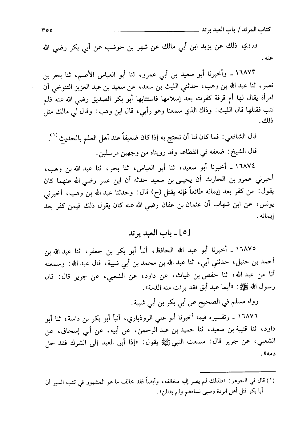 16874 - أَخْبَرَنَا أَبُو سَعِيدٍ، ثنا أَبُو الْعَبَّاسِ، ثنا بَحْرٌ، ثنا عَبْدُ اللهِ بْنُ وَهْبٍ، أَخْبَرَنِي عَمْرُو بْنُ الْحَارِثِ، أَنَّ يَحْيَى بْنَ سَعِيدٍ، حَدَّثَهُ، أَنَّ ابْنَ عُمَرَ رَضِيَ اللهُ عَنْهُمَا كَانَ يَقُولُ: " §مَنْ كَفَرَ بَعْدَ إِيمَانِهِ طَائِعًا، فَإِنَّهُ يُقْتَلُ "، ح، قَالَ: وَحَدَّثَنَا عَبْدُ اللهِ بْنُ وَهْبٍ، أَخْبَرَنِي يُونُسُ، عَنِ ابْنِ شِهَابٍ، أَنَّ عُثْمَانَ بْنَ عَفَّانَ رَضِيَ اللهُ عَنْهُ كَانَ يَقُولُ: ذَلِكَ فِيمَنْ كَفَرَ بَعْدَ إِيمَانِهِ