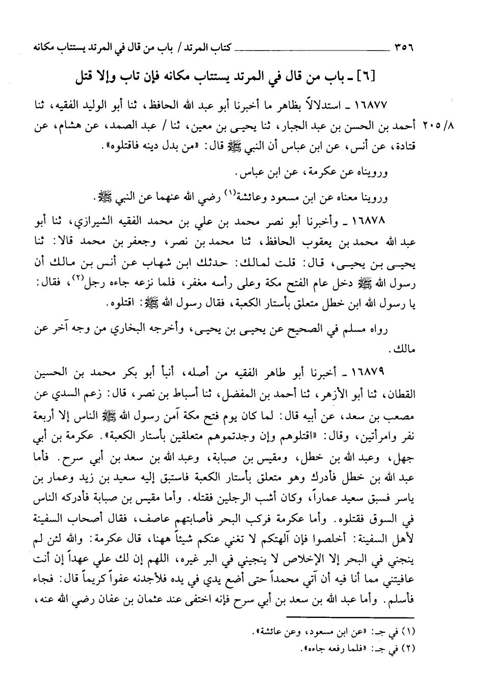 16877 - اسْتِدْلَالًا بِظَاهِرِ مَا أَخْبَرَنَا أَبُو عَبْدِ اللهِ الْحَافِظُ، ثنا أَبُو الْوَلِيدِ الْفَقِيهُ، ثنا أَحْمَدُ بْنُ الْحَسَنِ بْنِ عَبْدِ الْجَبَّارِ، ثنا يَحْيَى بْنُ مَعِينٍ، ثنا عَبْدُ الصَّمَدِ، عَنْ هِشَامٍ، عَنْ قَتَادَةَ، عَنْ أَنَسٍ، عَنِ ابْنِ عَبَّاسٍ، أَنَّ النَّبِيَّ صَلَّى اللهُ عَلَيْهِ وَسَلَّمَ قَالَ: " §مَنْ بَدَّلَ دِينَهُ فَاقْتُلُوهُ " وَرُوِّينَاهُ عَنْ عِكْرِمَةَ، عَنِ ابْنِ عَبَّاسٍ وَرُوِّينَا مَعْنَاهُ عَنِ ابْنِ مَسْعُودٍ وَعَائِشَةَ رَضِيَ اللهُ عَنْهُمَا، عَنِ النَّبِيِّ صَلَّى اللهُ عَلَيْهِ وَسَلَّمَ