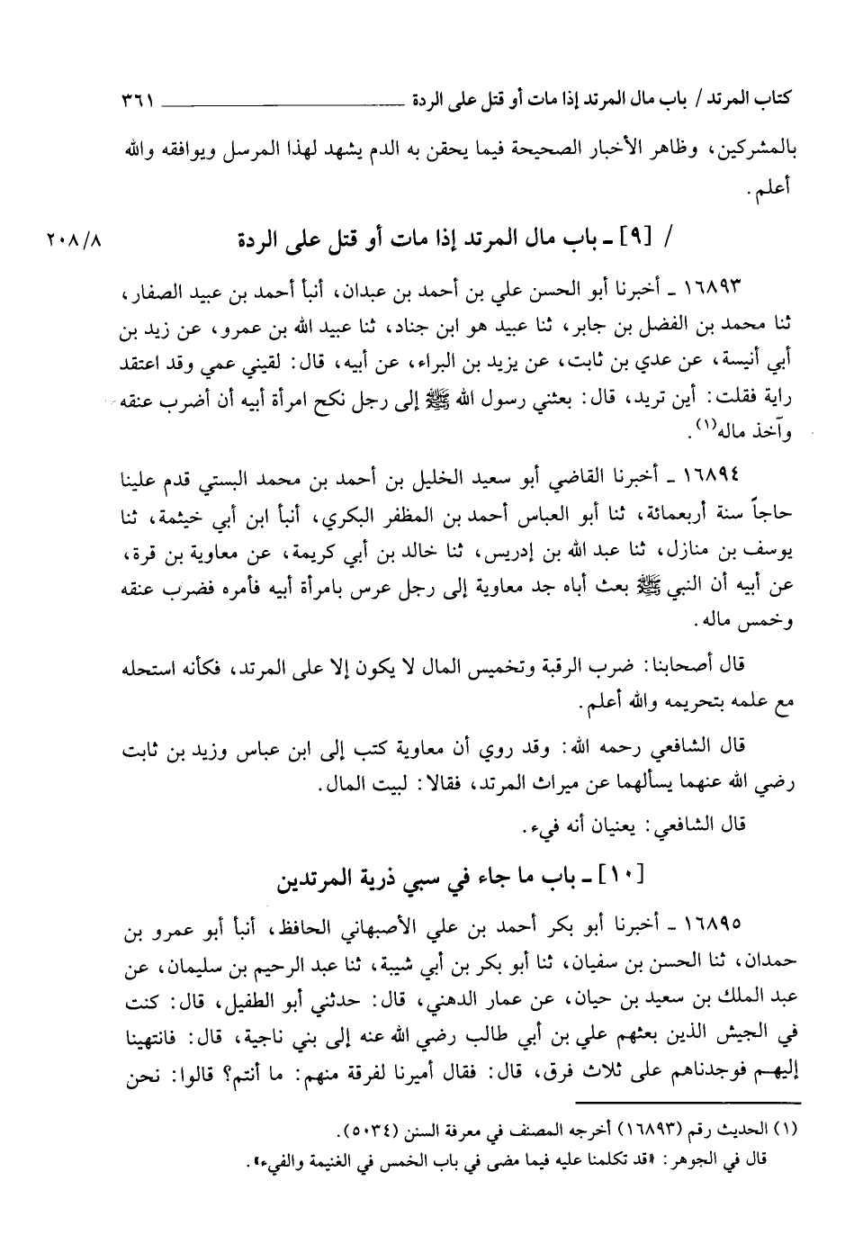 16894 - أَخْبَرَنَا الْقَاضِي أَبُو سَعِيدٍ الْخَلِيلُ بْنُ أَحْمَدَ بْنِ مُحَمَّدٍ الْبَسْتِيُّ، قَدِمَ عَلَيْنَا حَاجًّا سَنَةَ أَرْبَعِمِائَةٍ، ثنا أَبُو الْعَبَّاسِ أَحْمَدُ بْنُ الْمُظَفَّرِ الْبَكْرِيُّ، أنبأ ابْنُ أَبِي خَيْثَمَةَ، ثنا يُوسُفُ بْنُ مَنَازِلٍ، ثنا عَبْدُ اللهِ بْنُ إِدْرِيسَ، ثنا خَالِدُ بْنُ أَبِي كَرِيمَةَ، عَنْ مُعَاوِيَةَ بْنِ قُرَّةَ، عَنْ أَبِيهِ، أَنَّ النَّبِيَّ صَلَّى اللهُ عَلَيْهِ وَسَلَّمَ " بَعَثَ أَبَاهُ، جَدَّ مُعَاوِيَةَ، إِلَى §رَجُلٍ عَرَّسَ بِامْرَأَةِ أَبِيهِ، فَأَمَرَهُ فَضَرَبَ عُنُقَهُ وَخَمَّسَ مَالَهُ " قَالَ أَصْحَابُنَا: ضَرْبُ الرَّقَبَةِ وَتَخْمِيسُ الْمَالِ لَا يَكُونُ إِلَّا عَلَى الْمُرْتَدِّ، فَكَأَنَّهُ اسْتَحَلَّهُ مَعَ عِلْمِهِ بِتَحْرِيمِهِ، وَاللهُ أَعْلَمُ قَالَ الشَّافِعِيُّ رَحِمَهُ اللهُ: وَقَدْ رُوِيَ أَنَّ مُعَاوِيَةَ كَتَبَ إِلَى ابْنِ عَبَّاسٍ وَزَيْدِ بْنِ ثَابِتٍ رَضِيَ اللهُ عَنْهُمَا يَسْأَلُهُمَا عَنْ مِيرَاثِ الْمُرْتَدِّ، فَقَالَا: لِبَيْتِ الْمَالِ قَالَ الشَّافِعِيُّ: يَعْنِيَانِ أَنَّهُ فَيْءٌ