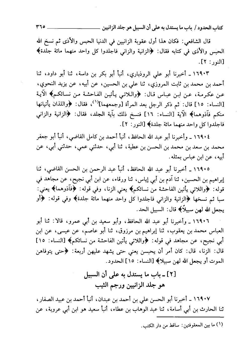 16905 - أَخْبَرَنَا أَبُو عَبْدِ اللهِ الْحَافِظُ، أنبأ عَبْدُ الرَّحْمَنِ بْنُ الْحَسَنِ الْقَاضِي، ثنا إِبْرَاهِيمُ بْنُ الْحُسَيْنِ، ثنا آدَمُ بْنُ أَبِي إِيَاسٍ، ثنا وَرْقَاءُ، عَنِ ابْنِ أَبِي نَجِيحٍ، عَنْ مُجَاهِدٍ، فِي قَوْلِهِ: " {وَاللَّاتِي يَأْتِينَ الْفَاحِشَةَ مِنْ نِسَائِكُمْ} [النساء: 15]، §يَعْنِي الزِّنَا، وَفِي قَوْلِهِ: {فَآذُوهُمَا} [النساء: 16] يَعْنِي سَبًّا، ثُمَّ نَسَخَهَا {الزَّانِيَةُ وَالزَّانِي فَاجْلِدُوا كُلَّ وَاحِدٍ مِنْهُمَا مِائَةَ جَلْدَةٍ}، وَفِي قَوْلِهِ: {أَوْ يَجْعَلَ اللهُ لَهُنَّ سَبِيلًا} [النساء: 15]، قَالَ: السَّبِيلُ الْحَدُّ "