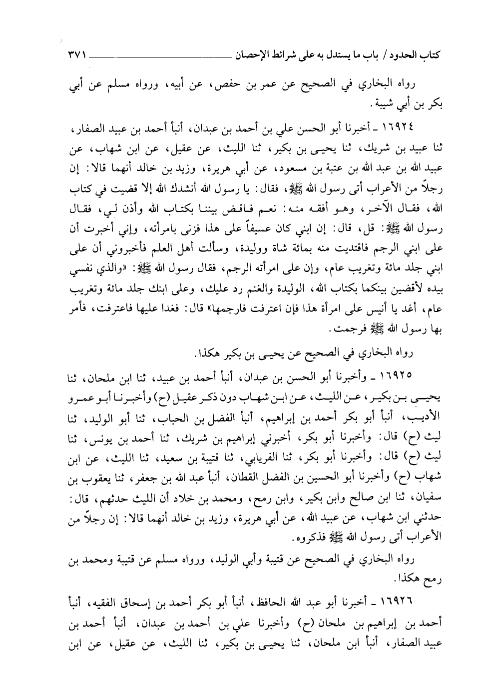 16925 - وَأَخْبَرَنَا أَبُو الْحَسَنِ بْنُ عَبْدَانَ، أنبأ أَحْمَدُ بْنُ عُبَيْدٍ، ثنا ابْنُ مِلْحَانَ، ثنا يَحْيَى بْنُ بُكَيْرٍ، عَنِ اللَّيْثِ، عَنِ ابْنِ شِهَابٍ، دُونَ ذِكْرِ عُقَيْلٍ، ح وَأَخْبَرَنَا أَبُو عَمْرٍو الْأَدِيبُ، أنبأ أَبُو بَكْرٍ أَحْمَدُ بْنُ إِبْرَاهِيمَ، أنبأ الْفَضْلُ بْنُ الْحُبَابِ، ثنا أَبُو الْوَلِيدِ، ثنا لَيْثٌ، ح قَالَ: وَأَخْبَرَنَا أَبُو بَكْرٍ، أَخْبَرَنِي إِبْرَاهِيمُ بْنُ شَرِيكٍ، ثنا أَحْمَدُ بْنُ يُونُسَ، ثنا لَيْثٌ، ح قَالَ: وَأَخْبَرَنَا أَبُو بَكْرٍ، ثنا الْفِرْيَابِيُّ، ثنا قُتَيْبَةُ بْنُ سَعِيدٍ، ثنا اللَّيْثُ، عَنِ ابْنِ شِهَابٍ، ح وَأَخْبَرَنَا أَبُو الْحُسَيْنِ بْنُ الْفَضْلِ الْقَطَّانُ، أنبأ عَبْدُ اللهِ بْنُ جَعْفَرٍ، ثنا يَعْقُوبُ بْنُ سُفْيَانَ، ثنا ابْنُ صَالِحٍ، وَابْنُ بُكَيْرٍ، وَابْنُ رُمْحٍ، وَمُحَمَّدُ بْنُ خَلَّادٍ، أَنَّ اللَّيْثَ حَدَّثَهُمْ قَالَ: حَدَّثَنِي ابْنُ شِهَابٍ، عَنْ عُبَيْدِ اللهِ، عَنْ أَبِي هُرَيْرَةَ، وَزَيْدِ بْنِ خَالِدٍ، أَنَّهُمَا قَالَا: إِنَّ رَجُلًا مِنَ الْأَعْرَابِ أَتَى رَسُولَ اللهِ صَلَّى اللهُ عَلَيْهِ وَسَلَّمَ، فَذَكَرُوهُ رَوَاهُ الْبُخَارِيُّ فِي الصَّحِيحِ عَنْ قُتَيْبَةَ وَأَبِي الْوَلِيدِ، وَرَوَاهُ مُسْلِمٌ عَنْ قُتَيْبَةَ وَمُحَمَّدِ بْنِ رُمْحٍ هَكَذَا