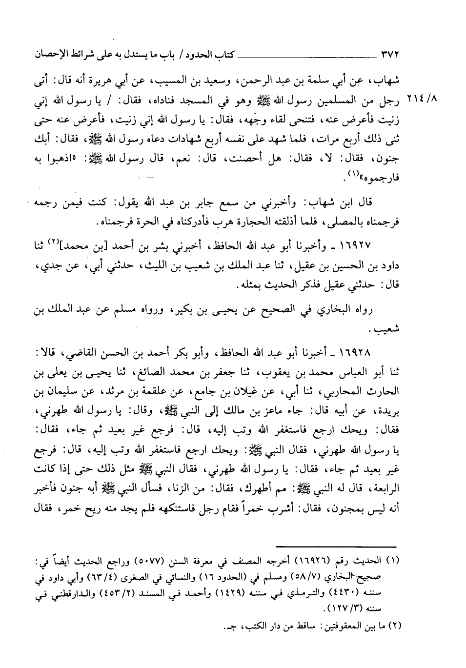 16928 - أَخْبَرَنَا أَبُو عَبْدِ اللهِ الْحَافِظُ، وَأَبُو بَكْرٍ أَحْمَدُ بْنُ الْحَسَنِ الْقَاضِي، قَالَا: ثنا أَبُو الْعَبَّاسِ مُحَمَّدُ بْنُ يَعْقُوبَ، ثنا جَعْفَرُ بْنُ مُحَمَّدٍ الصَّائِغُ، ثنا يَحْيَى بْنُ يَعْلَى بْنِ الْحَارِثِ الْمُحَارِبِيُّ، ثنا أَبِي، عَنْ غَيْلَانَ بْنِ جَامِعٍ، عَنْ عَلْقَمَةَ بْنِ مَرْثَدٍ، عَنْ سُلَيْمَانَ بْنِ بُرَيْدَةَ، عَنْ أَبِيهِ، قَالَ: " جَاءَ مَاعِزُ بْنُ مَالِكٍ إِلَى النَّبِيِّ صَلَّى اللهُ عَلَيْهِ وَسَلَّمَ وَقَالَ: يَا رَسُولَ اللهِ طَهِّرْنِي، فَقَالَ: " §وَيْحَكَ ارْجِعْ فَاسْتَغْفِرِ اللهَ وَتُبْ إِلَيْهِ " قَالَ: فَرَجَعَ غَيْرَ بَعِيدٍ، ثُمَّ جَاءَ فَقَالَ: يَا رَسُولَ اللهِ طَهِّرْنِي، فَقَالَ النَّبِيُّ صَلَّى اللهُ عَلَيْهِ وَسَلَّمَ: " وَيْحَكَ ارْجِعْ فَاسْتَغْفِرِ اللهَ وَتُبْ إِلَيْهِ " قَالَ: فَرَجَعَ غَيْرَ بَعِيدٍ، ثُمَّ جَاءَ فَقَالَ: يَا رَسُولَ اللهِ طَهِّرْنِي، فَقَالَ النَّبِيُّ صَلَّى اللهُ عَلَيْهِ وَسَلَّمَ مِثْلَ ذَلِكَ، حَتَّى إِذَا كَانَتِ الرَّابِعَةُ قَالَ لَهُ النَّبِيُّ صَلَّى اللهُ عَلَيْهِ وَسَلَّمَ: " مِمَّ أُطَهِّرُكَ؟ " فَقَالَ: مِنَ الزِّنَا، فَسَأَلَ النَّبِيُّ صَلَّى اللهُ عَلَيْهِ وَسَلَّمَ: " أَبِهِ جُنُونٌ؟ " فَأُخْبِرَ أَنَّهُ لَيْسَ بِمَجْنُونٍ، فَقَالَ: " أَشَرِبَ خَمْرًا؟ " فَقَامَ رَجُلٌ فَاسْتَنْكَهَهُ فَلَمْ يَجِدْ مِنْهُ رِيحَ خَمْرٍ، فَقَالَ -[373]- النَّبِيُّ صَلَّى اللهُ عَلَيْهِ وَسَلَّمَ: " أَثَيِّبٌ أَنْتَ؟ " قَالَ: نَعَمْ، فَأَمَرَ بِهِ فَرُجِمَ، فَكَانَ النَّاسُ فِيهِ فَرِيقَيْنِ، تَقُولُ فِرْقَةٌ: لَقَدْ هَلَكَ مَاعِزٌ عَلَى أَسْوَأِ عَمَلِهِ، لَقَدْ أَحَاطَتْ بِهِ خَطِيئَتُهُ، وَقَائِلٌ يَقُولُ: أَتَوْبَةٌ أَفْضَلُ مِنْ تَوْبَةِ مَاعِزٍ أَنْ جَاءَ إِلَى رَسُولِ اللهِ صَلَّى اللهُ عَلَيْهِ وَسَلَّمَ فَوَضَعَ يَدَهُ فِي يَدِهِ فَقَالَ: اقْتُلْنِي بِالْحِجَارَةِ قَالَ: فَلَبِثُوا بِذَلِكَ يَوْمَيْنِ أَوْ ثَلَاثَةً، ثُمَّ جَاءَ النَّبِيُّ صَلَّى اللهُ عَلَيْهِ وَسَلَّمَ، وَهُمْ جُلُوسٌ، فَسَلَّمَ ثُمَّ قَالَ: " اسْتَغْفِرُوا لِمَاعِزِ بْنِ مَالِكٍ " قَالَ: فَقَالُوا: يَغْفِرُ اللهُ لِمَاعِزِ بْنِ مَالِكٍ؟ قَالَ: فَقَالَ النَّبِيُّ صَلَّى اللهُ عَلَيْهِ وَسَلَّمَ: " لَقَدْ تَابَ تَوْبَةً لَوْ قُسِمَتْ بَيْنَ أُمَّةٍ لَوَسِعَتْهَا " قَالَ: ثُمَّ جَاءَتْهُ امْرَأَةٌ مِنْ غَامِدٍ مِنَ الْأَزْدِ قَالَتْ: يَا رَسُولَ اللهِ طَهِّرْنِي، قَالَ: " وَيْحَكِ ارْجِعِي فَاسْتَغْفِرِي اللهَ وَتُوبِي إِلَيْهِ " قَالَتْ: لَعَلَّكَ تُرِيدُ أَنْ تَرْدُدَنِي كَمَا رَدَدْتَ مَاعِزَ بْنَ مَالِكٍ؟ قَالَ: " وَمَا ذَاكَ؟ " قَالَتْ: إِنَّهَا حُبْلَى مِنَ الزِّنَا، فَقَالَ: " أَثَيِّبٌ أَنْتِ؟ " قَالَتْ: نَعَمْ، قَالَ: " إِذًا لَا نَرْجُمُكِ حَتَّى تَضَعِي مَا فِي بَطْنِكِ " قَالَ: فَكَفَلَهَا رَجُلٌ مِنَ الْأَنْصَارِ حَتَّى وَضَعَتْ، فَأَتَى النَّبِيَّ صَلَّى اللهُ عَلَيْهِ وَسَلَّمَ فَقَالَ: قَدْ وَضَعَتِ الْغَامِدِيَّةُ، فَقَالَ: " إِذًا لَا نَرْجُمُهَا وَنَدَعُ وَلَدَهَا صَغِيرًا لَيْسَ لَهُ مَنْ يُرْضِعُهُ " فَقَامَ رَجُلٌ مِنَ الْأَنْصَارِ فَقَالَ: إِلِيَّ رَضَاعُهُ يَا نَبِيَّ اللهِ، فَرَجَمَهَا " رَوَاهُ مُسْلِمٌ فِي الصَّحِيحِ عَنْ أَبِي كُرَيْبٍ، عَنْ يَحْيَى بْنِ يَعْلَى