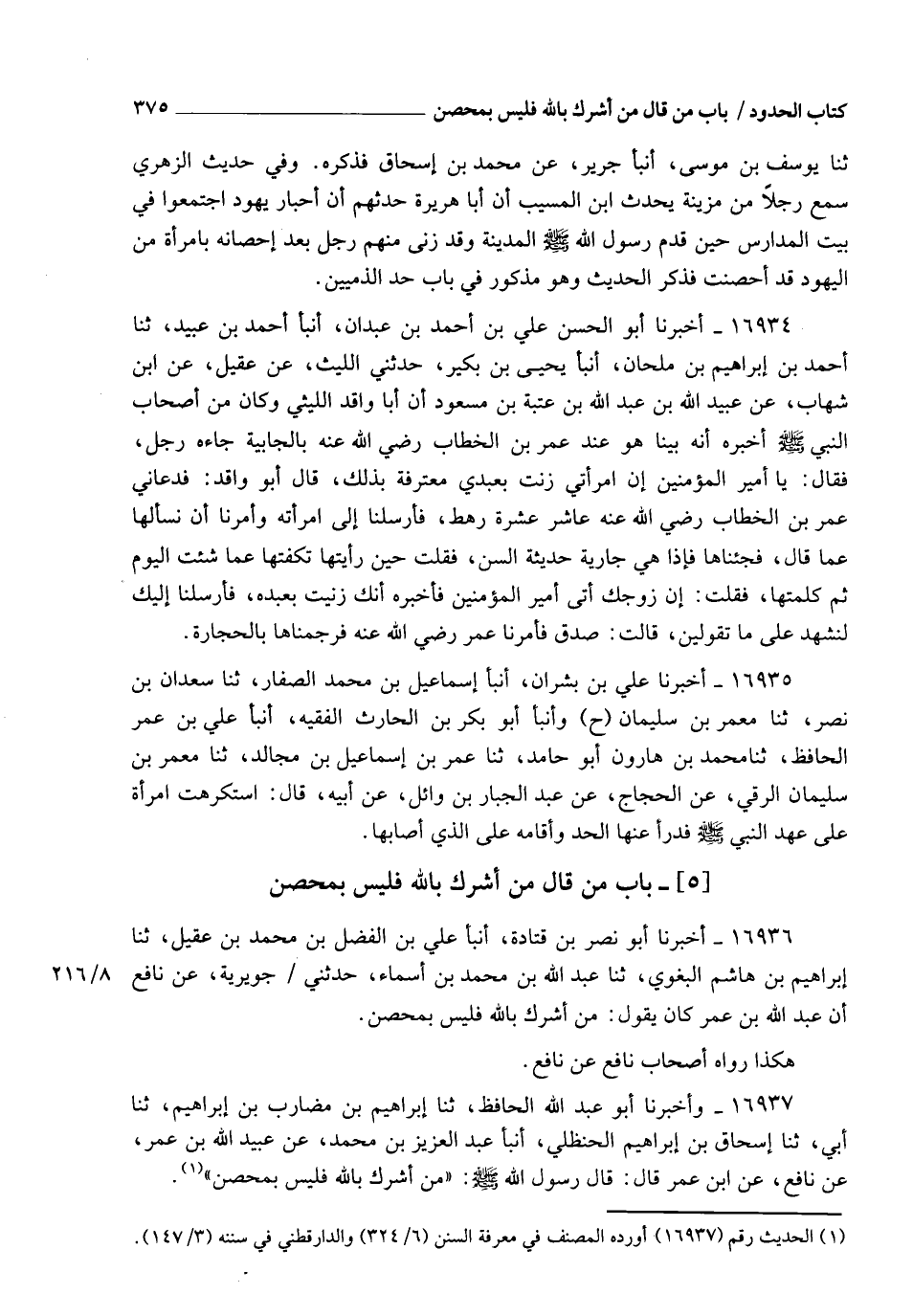 16937 - وَأَخْبَرَنَا أَبُو عَبْدِ اللهِ الْحَافِظُ، ثنا إِبْرَاهِيمُ بْنُ مُضَارِبِ بْنِ إِبْرَاهِيمَ، ثنا أَبِي، ثنا إِسْحَاقُ بْنُ إِبْرَاهِيمَ الْحَنْظَلِيُّ، أنبأ عَبْدُ الْعَزِيزِ بْنُ مُحَمَّدٍ، عَنْ عُبَيْدِ اللهِ بْنِ عُمَرَ، عَنْ نَافِعٍ، عَنِ ابْنِ عُمَرَ، قَالَ: قَالَ رَسُولُ اللهِ صَلَّى اللهُ عَلَيْهِ وَسَلَّمَ: §" مَنْ أَشْرَكَ بِاللهِ فَلَيْسَ بِمُحْصَنٍ " -[376]-