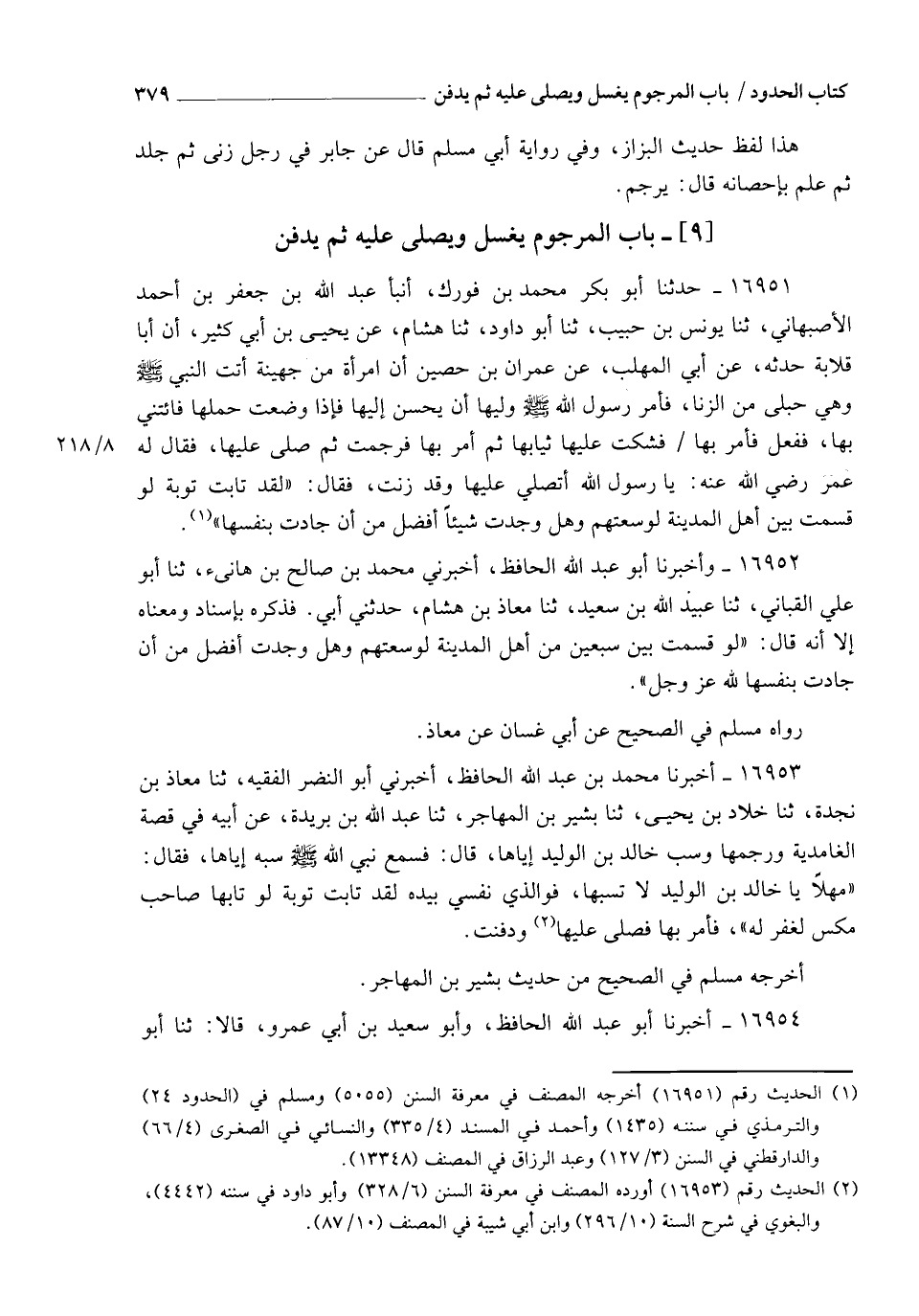 16951 - حَدَّثَنَا أَبُو بَكْرٍ مُحَمَّدُ بْنُ الْحَسَنِ بْنِ فُورَكٍ، أنبأ عَبْدُ اللهِ بْنُ جَعْفَرِ بْنِ أَحْمَدَ الْأَصْبَهَانِيُّ، ثنا يُونُسُ بْنُ حَبِيبٍ، ثنا أَبُو دَاوُدَ، ثنا هِشَامٌ، عَنْ يَحْيَى بْنِ أَبِي كَثِيرٍ، أَنَّ أَبَا قِلَابَةَ، حَدَّثَهُ، عَنْ أَبِي الْمُهَلَّبِ، عَنْ عِمْرَانَ بْنِ حُصَيْنٍ، " أَنَّ امْرَأَةً، مِنْ جُهَيْنَةَ أَتَتِ النَّبِيَّ صَلَّى اللهُ عَلَيْهِ وَسَلَّمَ، وَهِيَ حُبْلَى مِنَ الزِّنَا، فَأَمَرَ رَسُولُ اللهِ صَلَّى اللهُ عَلَيْهِ وَسَلَّمَ وَلِيَّهَا أَنْ يُحْسِنَ إِلَيْهَا، فَإِذَا وَضَعَتْ حَمْلَهَا فَائْتِنِي بِهَا، فَفَعَلَ فَأَمَرَ بِهَا فَشُكَّتْ عَلَيْهَا ثِيَابُهَا، ثُمَّ أَمَرَ بِهَا فَرُجِمَتْ، ثُمَّ صَلَّى عَلَيْهَا، فَقَالَ لَهُ عُمَرُ رَضِيَ اللهُ عَنْهُ: يَا رَسُولَ اللهِ أَتُصَلِّي عَلَيْهَا وَقَدْ زَنَتْ؟ فَقَالَ: §" لَقَدْ تَابَتْ تَوْبَةً لَوْ قُسِمَتْ بَيْنَ أَهْلِ الْمَدِينَةِ لَوَسِعَتْهُمْ، وَهَلْ وَجَدْتَ شَيْئًا أَفْضَلَ مِنْ أَنْ جَادَتْ بِنَفْسِهَا "