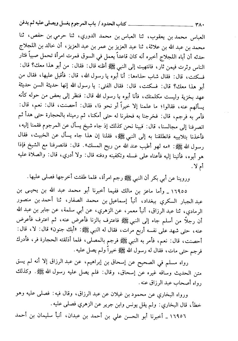 16955 - وَأَمَّا مَاعِزُ بْنُ مَالِكٍ، فَفِيمَا أَخْبَرَنَا أَبُو مُحَمَّدٍ عَبْدُ اللهِ بْنُ يَحْيَى بْنِ عَبْدِ الْجَبَّارِ السُّكَّرِيُّ، بِبَغْدَادَ، أنبأ إِسْمَاعِيلُ بْنُ مُحَمَّدٍ الصَّفَّارُ، ثنا أَحْمَدُ بْنُ مَنْصُورٍ الرَّمَادِيُّ، ثنا عَبْدُ الرَّزَّاقِ، أنبأ مَعْمَرٌ، عَنِ الزُّهْرِيِّ، عَنْ أَبِي سَلَمَةَ، عَنْ جَابِرِ بْنِ عَبْدِ اللهِ، " أَنَّ رَجُلًا مِنْ أَسْلَمَ جَاءَ إِلَى النَّبِيِّ صَلَّى اللهُ عَلَيْهِ وَسَلَّمَ فَاعْتَرَفَ بِالزِّنَا، فَأَعْرَضَ عَنْهُ، ثُمَّ اعْتَرَفَ فَأَعْرَضَ عَنْهُ، حَتَّى شَهِدَ عَلَى نَفْسِهِ أَرْبَعَ مَرَّاتٍ، فَقَالَ لَهُ النَّبِيُّ صَلَّى اللهُ عَلَيْهِ وَسَلَّمَ: " §أَبِكَ جُنُونٌ؟ " قَالَ: لَا، قَالَ: " أَحْصَنْتَ؟ " قَالَ: نَعَمْ، فَأَمَرَ بِهِ النَّبِيُّ صَلَّى اللهُ عَلَيْهِ وَسَلَّمَ فَرُجِمَ بِالْمُصَلَّى، فَلَمَّا أَذْلَقَتْهُ الْحِجَارَةُ فَرَّ، فَأُدْرِكَ فَرُجِمَ حَتَّى مَاتَ، فَقَالَ لَهُ رَسُولُ اللهِ صَلَّى اللهُ عَلَيْهِ وَسَلَّمَ خَيْرًا، وَلَمْ يُصَلِّ عَلَيْهِ رَوَاهُ مُسْلِمٌ فِي الصَّحِيحِ عَنْ إِسْحَاقَ بْنِ إِبْرَاهِيمَ، عَنْ عَبْدِ الرَّزَّاقِ، إِلَّا أَنَّهُ لَمْ يَسُقْ مَتْنَ الْحَدِيثِ، وَسَاقَهُ غَيْرُهُ عَنْ إِسْحَاقَ، وَقَالَ: فَلَمْ يُصَلِّ عَلَيْهِ رَسُولُ اللهِ صَلَّى الله عَلَيْهِ، وَسَلَّمَ وَكَذَلِكَ رَوَاهُ أَصْحَابُ عَبْدِ الرَّزَّاقِ عَنْهُ وَرَوَاهُ الْبُخَارِيُّ عَنْ مَحْمُودِ بْنِ غَيْلَانَ، عَنْ عَبْدِ الرَّزَّاقِ، وَقَالَ فِيهِ: فَصَلَّى عَلَيْهِ وَهُوَ خَطَأٌ، قَالَ الْبُخَارِيُّ: وَلَمْ يَقُلْ يُونُسُ وَابْنُ جَرِيرٍ، عَنِ الزُّهْرِيِّ: فَصَلَّى عَلَيْهِ