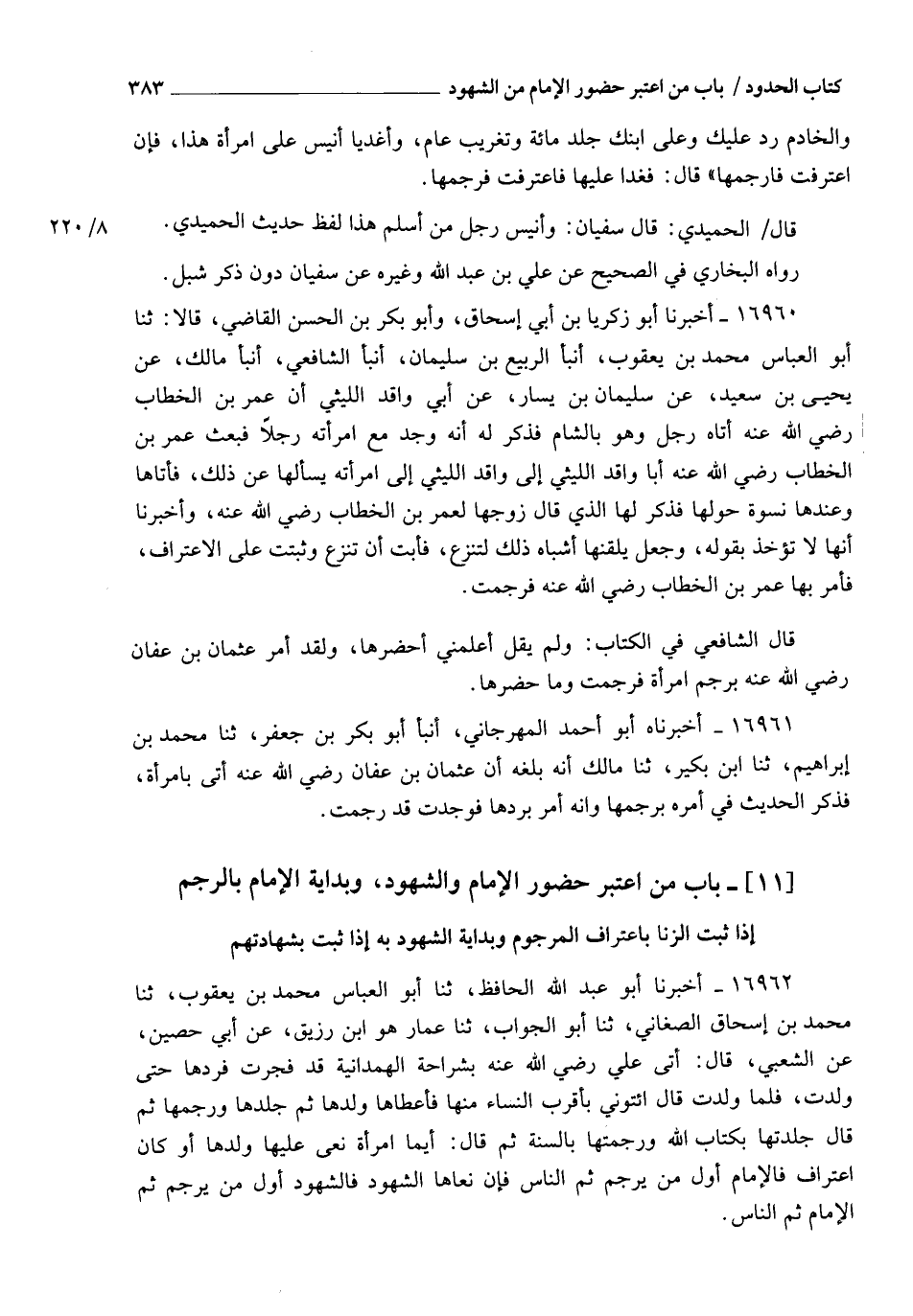 §بَابُ مَنِ اعْتَبَرَ حُضُورَ الْإِمَامِ وَالشُّهُودِ، وَبِدَايَةَ الْإِمَامِ بِالرَّجْمِ إِذَا ثَبَتَ الزِّنَا بِاعْتِرَافِ الْمَرْجُومِ، وَبِدَايَةَ الشُّهُودِ بِهِ إِذَا ثَبَتَ بِشَهَادَتِهِمْ