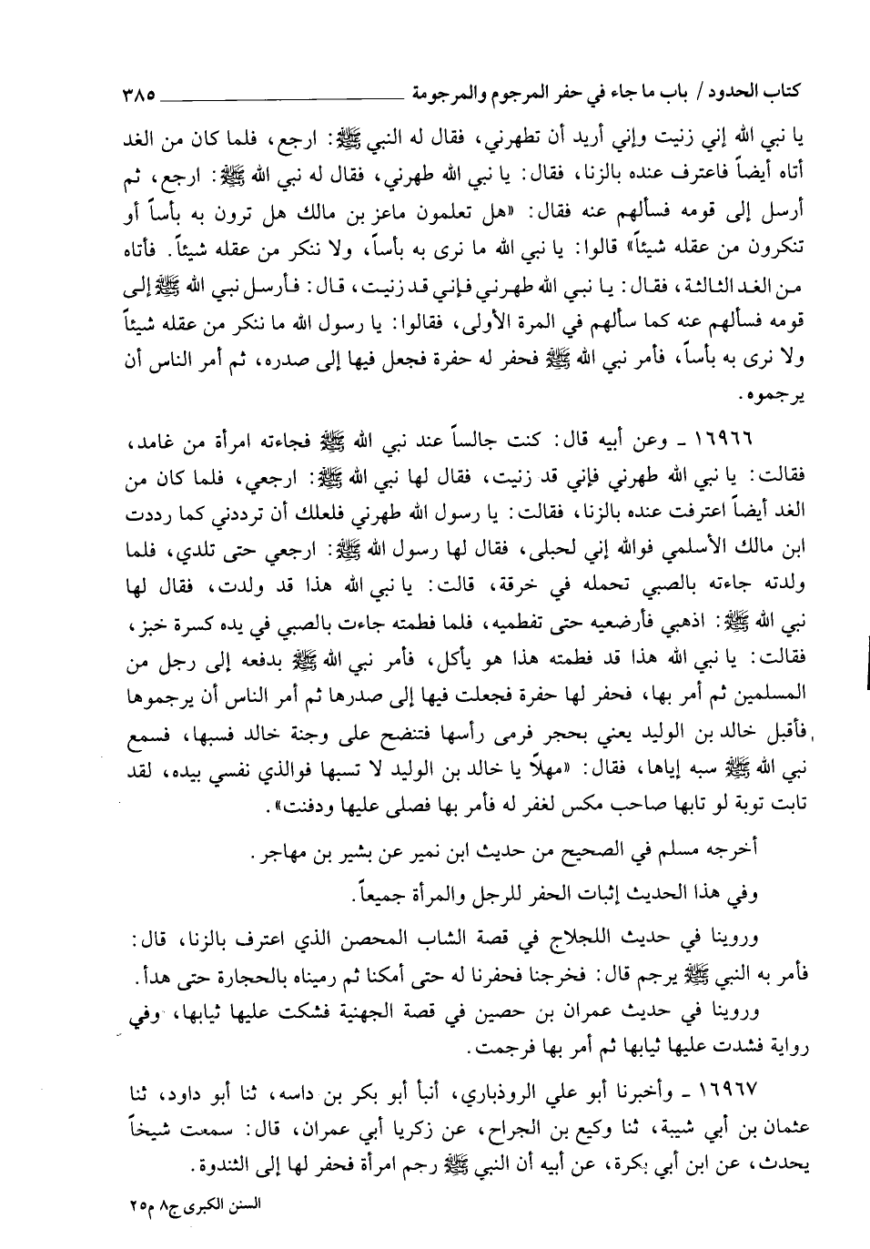 16966 - وَعَنْ أَبِيهِ، قَالَ: كُنْتُ جَالِسًا عِنْدَ نَبِيِّ اللهِ صَلَّى اللهُ عَلَيْهِ وَسَلَّمَ، فَجَاءَتْهُ امْرَأَةٌ مِنْ غَامِدٍ فَقَالَتْ: يَا نَبِيَّ اللهِ طَهِّرْنِي فَإِنِّي قَدْ زَنَيْتُ، فَقَالَ لَهَا نَبِيُّ اللهِ صَلَّى اللهُ عَلَيْهِ وَسَلَّمَ: " ارْجِعِي " فَلَمَّا كَانَ مِنَ الْغَدِ أَيْضًا اعْتَرَفَتْ عِنْدَهُ بِالزِّنَا، فَقَالَتْ: يَا رَسُولَ اللهِ طَهِّرْنِي، فَلَعَلَّكَ أَنْ تَرْدُدَنِي كَمَا رَدَدْتَ ابْنَ مَالِكٍ الْأَسْلَمِيَّ، فَوَاللهِ إِنِّي لَحُبْلَى، فَقَالَ لَهَا رَسُولُ اللهِ صَلَّى اللهُ عَلَيْهِ وَسَلَّمَ: " ارْجِعِي حَتَّى تَلِدِي " فَلَمَّا وَلَدَتْهُ جَاءَتْهُ بِالصَّبِيِّ تَحْمِلُهُ فِي خِرْقَةٍ قَالَتْ: يَا نَبِيَّ اللهِ هَذَا قَدْ وَلَدْتُ، فَقَالَ لَهَا نَبِيُّ اللهِ صَلَّى اللهُ عَلَيْهِ وَسَلَّمَ: " اذْهَبِي فَأَرْضِعِيهِ حَتَّى تَفْطِمِيهِ " فَلَمَّا فَطَمَتْهُ جَاءَتْ بِالصَّبِيِّ فِي يَدِهِ كِسْرَةُ خُبْزٍ، فَقَالَتْ: يَا نَبِيَّ اللهِ هَذَا قَدْ فَطَمْتُهُ، هَذَا هُوَ يَأْكُلُ، فَأَمَرَ نَبِيُّ اللهِ صَلَّى اللهُ عَلَيْهِ وَسَلَّمَ بِدَفْعِهِ إِلَى رَجُلٍ مِنَ الْمُسْلِمِينَ، ثُمَّ §أَمَرَ بِهَا فَحُفِرَ لَهَا حُفْرَةٌ، فَجُعِلَتْ فِيهَا إِلَى صَدْرِهَا، ثُمَّ أَمَرَ النَّاسَ أَنْ يَرْجُمُوهَا، فَأَقْبَلَ خَالِدُ بْنُ الْوَلِيدِ، يَعْنِي بِحَجَرٍ، فَرَمَى رَأْسَهَا فَتَنَضَّخَ عَلَى وَجْنَةِ خَالِدٍ فَسَبَّهَا، فَسَمِعَ نَبِيُّ اللهِ صَلَّى اللهُ عَلَيْهِ وَسَلَّمَ سَبَّهُ إِيَّاهَا فَقَالَ: " مَهْلًا يَا خَالِدُ بْنَ الْوَلِيدِ لَا تَسُبَّهَا، فَوَالَّذِي نَفْسِي بِيَدِهِ لَقَدْ تَابَتْ تَوْبَةً لَوْ تَابَهَا صَاحِبُ مَكْسٍ لَغُفِرَ لَهُ " فَأَمَرَ بِهَا فَصَلَّى عَلَيْهَا وَدُفِنَتْ أَخْرَجَهُ مُسْلِمٌ فِي الصَّحِيحِ مِنْ حَدِيثِ بْنِ نُمَيْرٍ، عَنْ بَشِيرِ بْنِ مُهَاجِرٍ وَفِي هَذَا الْحَدِيثِ إِثْبَاتُ الْحَفْرِ لِلرَّجُلِ وَالْمَرْأَةِ جَمِيعًا وَرُوِّينَا فِي حَدِيثِ اللَّجْلَاجِ فِي قِصَّةِ الشَّابِّ الْمُحْصِنِ الَّذِي اعْتَرَفَ بِالزِّنَا، قَالَ: فَأَمَرَ بِهِ النَّبِيُّ صَلَّى اللهُ عَلَيْهِ وَسَلَّمَ يُرْجَمُ، قَالَ: فَخَرَجْنَا بِهِ فَحَفَرْنَا لَهُ حَتَّى أَمْكَنَّا، ثُمَّ رَمَيْنَاهُ بِالْحِجَارَةِ حَتَّى هَدَأَ وَرُوِّينَا فِي حَدِيثِ عِمْرَانَ بْنِ حُصَيْنٍ فِي قِصَّةِ الْجُهَنِيَّةِ فَشُكَّتْ عَلَيْهَا ثِيَابُهَا، وَفِي رِوَايَةٍ فَشُدَّتْ عَلَيْهَا ثِيَابُهَا، ثُمَّ أُمِرَ بِهَا فَرُجِمَتْ