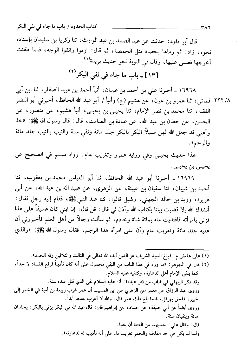 16968 - أَخْبَرَنَا عَلِيُّ بْنُ أَحْمَدَ بْنِ عَبْدَانَ، أنبأ أَحْمَدُ بْنُ عُبَيْدٍ الصَّفَّارُ، ثنا ابْنُ أَبِي قِمَاشٍ، ثنا عَمْرُو بْنُ عَوْنٍ، عَنْ هُشَيْمٍ، ح وَأنبأ أَبُو عَبْدِ اللهِ الْحَافِظُ، أَخْبَرَنِي أَبُو النَّضْرِ الْفَقِيهُ، ثنا مُحَمَّدُ بْنُ نَصْرٍ الْإِمَامُ، ثنا يَحْيَى بْنُ يَحْيَى، أنبأ هُشَيْمٌ، عَنْ مَنْصُورٍ، عَنِ الْحَسَنِ، عَنْ حِطَّانَ بْنِ عَبْدِ اللهِ، عَنْ عُبَادَةَ بْنِ الصَّامِتِ، قَالَ: قَالَ رَسُولُ اللهِ صَلَّى اللهُ عَلَيْهِ وَسَلَّمَ: " §خُذُوا عَنِّي، قَدْ جَعَلَ اللهُ لَهُنَّ سَبِيلًا: الْبِكْرُ بِالْبِكْرِ جَلْدُ مِائَةٍ وَنَفْيُ سَنَةٍ، وَالثَّيِّبُ بِالثَّيِّبِ جَلْدُ مِائَةٍ وَالرَّجْمُ " هَذَا حَدِيثُ يَحْيَى، وَفِي رِوَايَةِ عَمْرٍو: " وَتَغْرِيبُ عَامٍ " رَوَاهُ مُسْلِمٌ فِي الصَّحِيحِ عَنْ يَحْيَى بْنِ يَحْيَى
