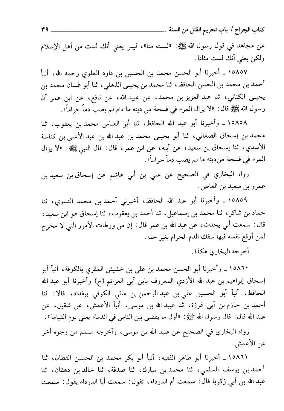 15857 - أَخْبَرَنَا أَبُو الْحَسَنِ مُحَمَّدُ بْنُ الْحُسَيْنِ بْنِ دَاوُدَ الْعَلَوِيُّ رَحِمَهُ اللهُ، أنبأ أَحْمَدُ بْنُ مُحَمَّدِ بْنِ الْحَسَنِ الْحَافِظُ، ثنا مُحَمَّدُ بْنُ يَحْيَى الذُّهْلِيُّ، ثنا أَبُو غَسَّانَ مُحَمَّدُ بْنُ يَحْيَى الْكِنَانِيُّ، ثنا عَبْدُ الْعَزِيزِ بْنُ مُحَمَّدٍ، عَنْ عُبَيْدِ اللهِ، عَنْ نَافِعٍ، عَنِ ابْنِ عُمَرَ، أَنَّ رَسُولَ اللهِ صَلَّى اللهُ عَلَيْهِ وَسَلَّمَ، قَالَ: §" لَا يَزَالُ الْمَرْءُ فِي فُسْحَةٍ مِنْ دِينِهِ مَا دَامَ لَمْ يُصِبْ دَمًا حَرَامًا "