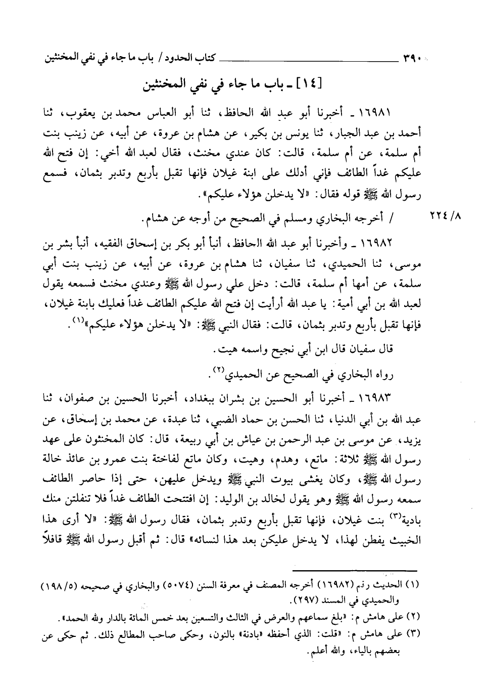 16982 - وَأَخْبَرَنَا أَبُو عَبْدِ اللهِ الْحَافِظُ، أنبأ أَبُو بَكْرِ بْنُ إِسْحَاقَ الْفَقِيهُ، أنبأ بِشْرُ بْنُ مُوسَى، ثنا الْحُمَيْدِيُّ، ثنا سُفْيَانُ، ثنا هِشَامُ بْنُ عُرْوَةَ، عَنْ أَبِيهِ، عَنْ زَيْنَبَ بِنْتِ أَبِي سَلَمَةَ، عَنْ أُمِّهَا أُمِّ سَلَمَةَ، قَالَتْ: دَخَلَ عَلَيَّ رَسُولُ اللهِ صَلَّى اللهُ عَلَيْهِ وَسَلَّمَ وَعِنْدِي مُخَنَّثٌ فَسَمِعَهُ يَقُولُ لِعَبْدِ اللهِ بْنِ أَبِي أُمَيَّةَ: يَا عَبْدَ اللهِ أَرَأَيْتَ إِنْ فَتَحَ اللهُ عَلَيْكُمُ الطَّائِفَ غَدًا فَعَلَيْكَ بِابْنَةِ غَيْلَانَ، فَإِنَّهَا تُقْبِلُ بِأَرْبَعٍ وَتُدْبِرُ بِثَمَانٍ، قَالَتْ: فَقَالَ النَّبِيُّ صَلَّى اللهُ عَلَيْهِ وَسَلَّمَ: " §لَا يَدْخُلَنَّ هَؤُلَاءِ عَلَيْكُمْ " قَالَ سُفْيَانُ: قَالَ ابْنُ أَبِي نَجِيحٍ: وَاسْمُهُ هِيتٌ رَوَاهُ الْبُخَارِيُّ فِي الصَّحِيحِ عَنِ الْحُمَيْدِيِّ