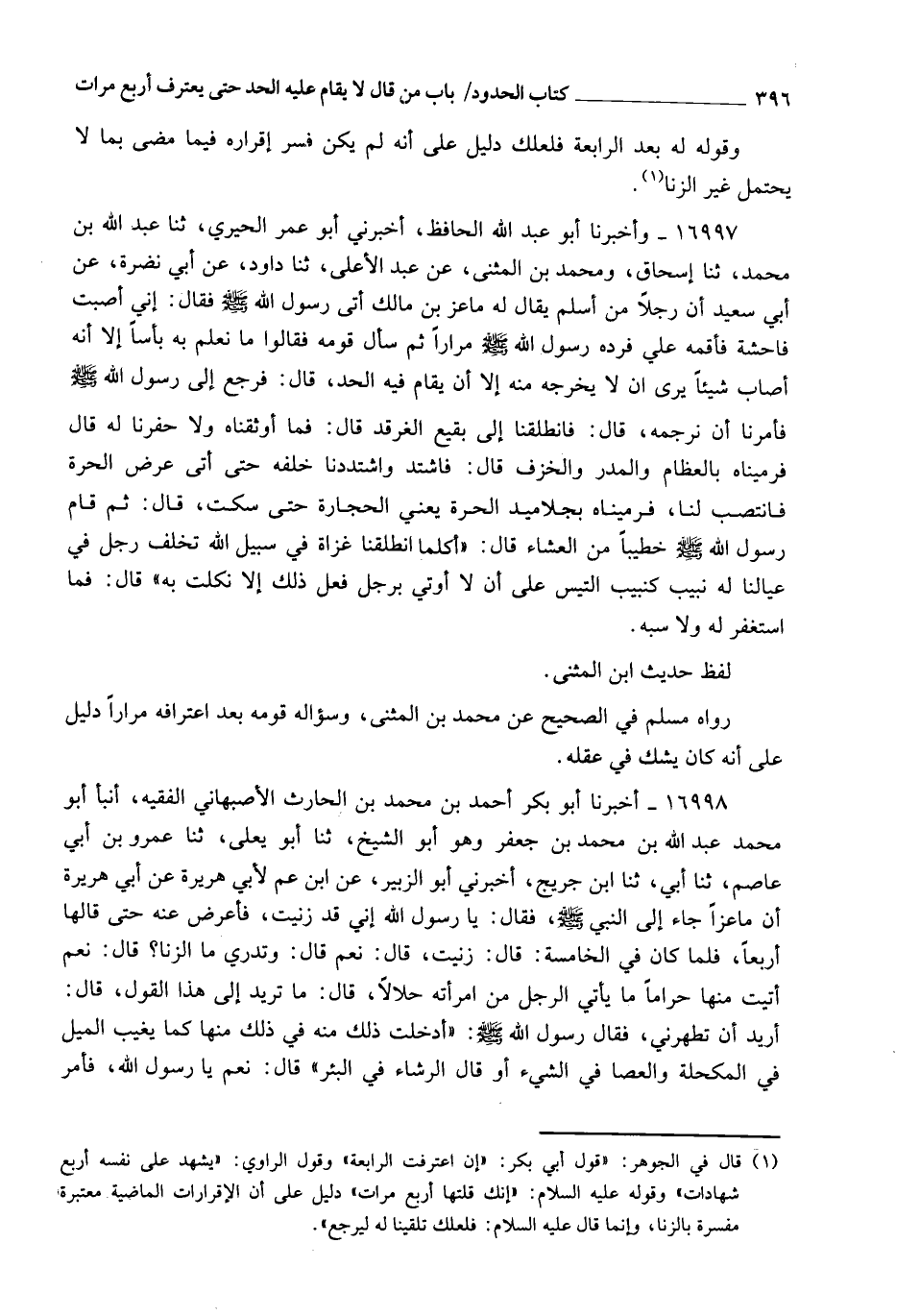 16997 - وَأَخْبَرَنَا أَبُو عَبْدِ اللهِ الْحَافِظُ، أَخْبَرَنِي أَبُو عَمْرٍو الْحِيرِيُّ، ثنا عَبْدُ اللهِ بْنُ مُحَمَّدٍ، ثنا إِسْحَاقُ، وَمُحَمَّدُ بْنُ الْمُثَنَّى، عَنْ عَبْدِ الْأَعْلَى، ثنا دَاوُدُ، عَنْ أَبِي نَضْرَةَ، عَنْ أَبِي سَعِيدٍ، أَنَّ رَجُلًا مِنْ أَسْلَمَ، يُقَالُ لَهُ: مَاعِزُ بْنُ مَالِكٍ، أَتَى رَسُولَ اللهِ صَلَّى اللهُ عَلَيْهِ وَسَلَّمَ فَقَالَ: إِنِّي أَصَبْتُ فَاحِشَةً، فَأَقِمْهُ عَلَيَّ، فَرَدَّهُ رَسُولُ اللهِ صَلَّى اللهُ عَلَيْهِ وَسَلَّمَ مِرَارًا، ثُمَّ سَأَلَ قَوْمَهُ، فَقَالُوا: مَا نَعْلَمُ بِهِ بَأْسًا إِلَّا أَنَّهُ أَصَابَ شَيْئًا يَرَى أَنْ لَا يُخْرِجَهُ مِنْهُ إِلَّا أَنْ يُقَامَ فِيهِ الْحَدُّ، قَالَ: فَرَجَعَ إِلَى رَسُولِ اللهِ صَلَّى اللهُ عَلَيْهِ وَسَلَّمَ، فَأَمَرَنَا أَنْ نَرْجُمَهُ، قَالَ: فَانْطَلَقْنَا إِلَى بَقِيعِ الْغَرْقَدِ، قَالَ: فَمَا أَوْثَقْنَاهُ، وَلَا حَفَرْنَا لَهُ، قَالَ: فَرَمَيْنَاهُ بِالْعِظَامِ وَالْمَدَرِ وَالْخَزَفِ، قَالَ: فَاشْتَدَّ وَاشْتَدَدْنَا خَلْفَهُ حَتَّى أَتَى عُرْضَ الْحَرَّةِ فَانْتَصَبَ لَنَا فَرَمَيْنَاهُ بِجَلَامِيدِ الْحَرَّةِ، يَعْنِي الْحِجَارَةَ، حَتَّى سَكَتَ، قَالَ: ثُمَّ قَامَ رَسُولُ اللهِ صَلَّى اللهُ عَلَيْهِ وَسَلَّمَ خَطِيبًا مِنَ الْعِشَاءِ قَالَ: §" أَكُلَّمَا انْطَلَقْنَا غُزَاةً فِي سَبِيلِ اللهِ تَخَلَّفَ رَجُلٌ فِي عِيَالِنَا لَهُ نَبِيبٌ كَنَبِيبِ التَّيْسِ، عَلَى أَنْ لَا أُوتَى بِرَجُلٍ فَعَلَ ذَلِكَ إِلَّا نَكَّلْتُ بِهِ " قَالَ: فَمَا اسْتَغْفَرَ لَهُ، وَلَا سَبَّهُ لَفْظُ حَدِيثِ ابْنِ الْمُثَنَّى رَوَاهُ مُسْلِمٌ فِي الصَّحِيحِ عَنْ مُحَمَّدِ بْنِ الْمُثَنَّى، وَسُؤَالُهُ قَوْمَهُ بَعْدَ اعْتِرَافِهِ مِرَارًا دَلِيلٌ عَلَى أَنَّهُ كَانَ يَشُكُّ فِي عَقْلِهِ