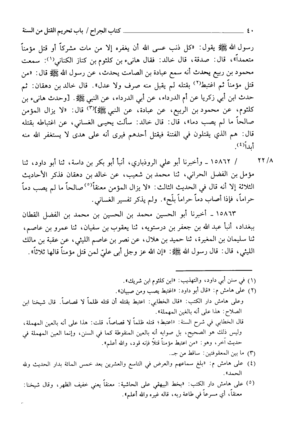 قَالَ صَدَقَةُ: قَالَ خَالِدٌ: فَقَالَ هَانِئُ بْنُ كُلْثُومِ بْنِ كِنَانِ الْكِنَانِيُّ: سَمِعْتُ مَحْمُودَ بْنَ رَبِيعٍ يُحَدِّثُ، أَنَّهُ سَمِعَ عُبَادَةَ بْنَ الصَّامِتِ يُحَدِّثُ عَنْ رَسُولِ اللهِ صَلَّى اللهُ عَلَيْهِ وَسَلَّمَ قَالَ: §" مَنْ قَتَلَ مُؤْمِنًا ثُمَّ اغْتَبَطَ بِقَتْلِهِ لَمْ يُقْبَلْ مِنْهُ صَرْفٌ وَلَا عَدْلٌ "