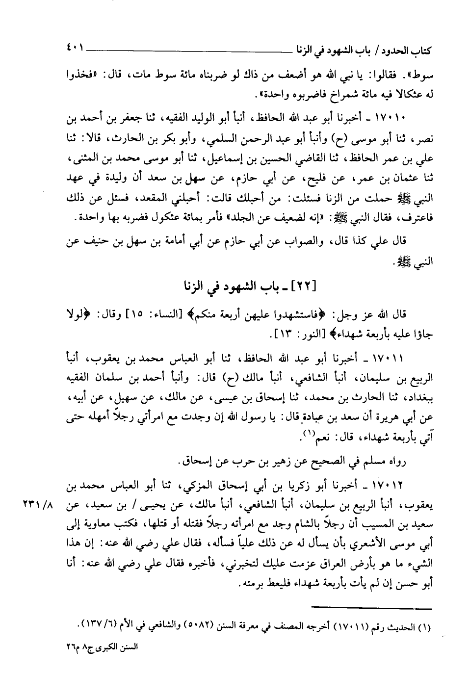 17011 - أَخْبَرَنَا أَبُو عَبْدِ اللهِ الْحَافِظُ، ثنا أَبُو الْعَبَّاسِ مُحَمَّدُ بْنُ يَعْقُوبَ، أنبأ الرَّبِيعُ بْنُ سُلَيْمَانَ، أنبأ الشَّافِعِيُّ، أنبأ مَالِكٌ، ح، قَالَ: وَأنبأ أَحْمَدُ بْنُ سَلْمَانَ الْفَقِيهُ، بِبَغْدَادَ، ثنا الْحَارِثُ بْنُ مُحَمَّدٍ، ثنا إِسْحَاقُ بْنُ عِيسَى، عَنْ مَالِكٍ، عَنْ سُهَيْلٍ، عَنْ أَبِيهِ، عَنْ أَبِي هُرَيْرَةَ، أَنَّ سَعْدَ بْنَ عُبَادَةَ قَالَ: يَا رَسُولَ اللهِ §إِنْ وَجَدْتُ مَعَ امْرَأَتِي رَجُلًا أُمْهِلْهُ حَتَّى آتِيَ بِأَرْبَعَةِ شُهَدَاءَ؟ قَالَ: " نَعَمْ " رَوَاهُ مُسْلِمٌ فِي الصَّحِيحِ عَنْ زُهَيْرِ بْنِ حَرْبٍ، عَنْ إِسْحَاقَ