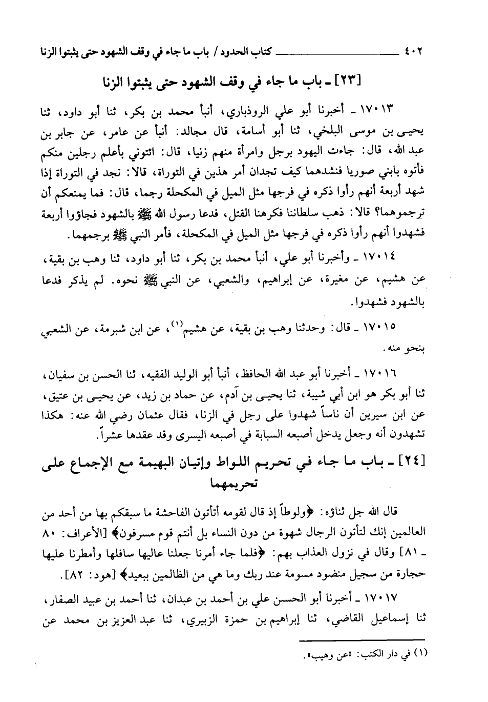 17013 - أَخْبَرَنَا أَبُو عَلِيٍّ الرُّوذْبَارِيُّ، أنبأ مُحَمَّدُ بْنُ بَكْرٍ، ثنا أَبُو دَاوُدَ، ثنا يَحْيَى بْنُ مُوسَى الْبَلْخِيُّ، ثنا أَبُو أُسَامَةَ، قَالَ: مُجَالِدٌ أنبأ، عَنْ عَامِرٍ، عَنْ جَابِرِ بْنِ عَبْدِ اللهِ، قَالَ: جَاءَتِ الْيَهُودُ بِرَجُلٍ وَامْرَأَةٍ مِنْهُمْ زَنَيَا، قَالَ: " ائْتُونِي بِأَعْلَمِ رَجُلَيْنِ مِنْكُمْ " فَأَتَوْهُ بِابْنَيْ صُورِيَا، فَنَشَدَهُمَا: " كَيْفَ تَجِدَانِ أَمْرَ هَذَيْنِ فِي التَّوْرَاةِ؟ " قَالَا: نَجِدُ فِي التَّوْرَاةِ: إِذَا شَهِدَ أَرْبَعَةٌ أَنَّهُمْ رَأَوْا ذَكَرَهُ فِي فَرْجِهَا مِثْلَ الْمِيلِ فِي الْمُكْحُلَةِ رُجِمَا، قَالَ: " فَمَا يَمْنَعُكُمْ أَنْ تَرْجُمُوهُمَا؟ " قَالَا: ذَهَبَ سُلْطَانُنَا، فَكَرِهْنَا الْقَتْلَ، §فَدَعَا رَسُولُ اللهِ صَلَّى اللهُ عَلَيْهِ وَسَلَّمَ بِالشُّهُودِ فَجَاءُوا أَرْبَعَةً فَشَهِدُوا أَنَّهُمْ رَأَوْا ذَكَرَهُ فِي فَرْجِهَا مِثْلَ الْمِيلِ فِي الْمُكْحُلَةِ، فَأَمَرَ النَّبِيُّ صَلَّى اللهُ عَلَيْهِ وَسَلَّمَ بِرَجْمِهِمَا