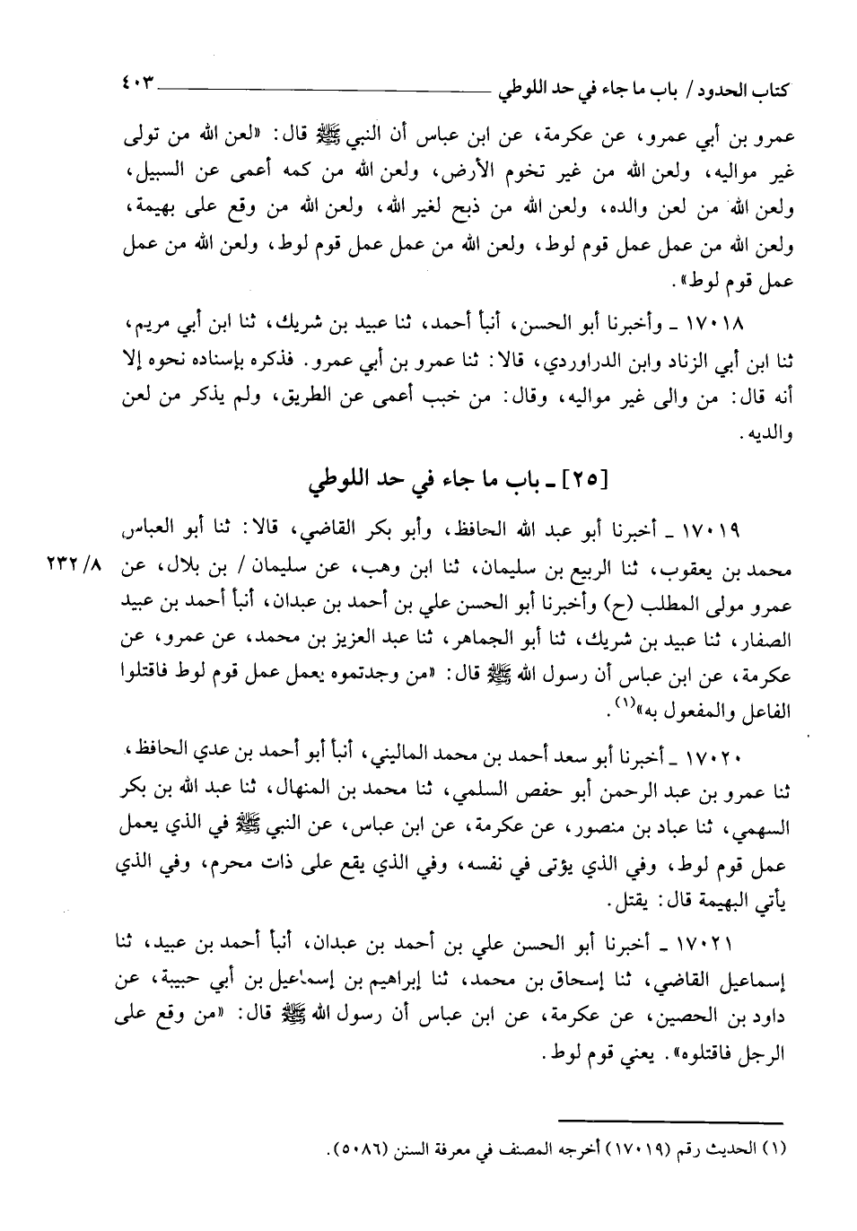 17021 - أَخْبَرَنَا أَبُو الْحَسَنِ عَلِيُّ بْنُ أَحْمَدَ بْنِ عَبْدَانَ، أنبأ أَحْمَدُ بْنُ عُبَيْدٍ، ثنا إِسْمَاعِيلُ الْقَاضِي، ثنا إِسْحَاقُ بْنُ مُحَمَّدٍ، ثنا إِبْرَاهِيمُ بْنُ إِسْمَاعِيلَ بْنِ أَبِي حَبِيبَةَ، عَنْ دَاوُدَ بْنِ الْحُصَيْنِ، عَنْ عِكْرِمَةَ، عَنِ ابْنِ عَبَّاسٍ، أَنَّ رَسُولَ اللهِ صَلَّى اللهُ عَلَيْهِ وَسَلَّمَ قَالَ: §" مَنْ وَقَعَ عَلَى الرَّجُلِ فَاقْتُلُوهُ " يَعْنِي قَوْمَ لُوطٍ