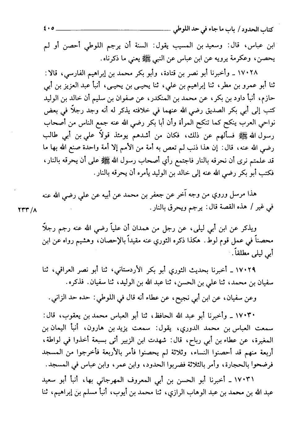 17029 - أَخْبَرَنَا بِحَدِيثِ الثَّوْرِيِّ أَبُو بَكْرٍ الْأَرْدَسْتَانِيُّ، ثنا أَبُو نَصْرٍ الْعِرَاقِيُّ، ثنا سُفْيَانُ بْنُ مُحَمَّدٍ، ثنا عَلِيُّ بْنُ الْحَسَنِ، ثنا عَبْدُ اللهِ بْنُ الْوَلِيدِ، ثنا سُفْيَانُ، فَذَكَرَهُ وَعَنْ سُفْيَانَ، عَنِ ابْنِ أَبِي نَجِيحٍ، عَنْ عَطَاءٍ، أَنَّهُ قَالَ فِي اللُّوطِيِّ: حَدُّهُ حَدُّ الزَّانِي
