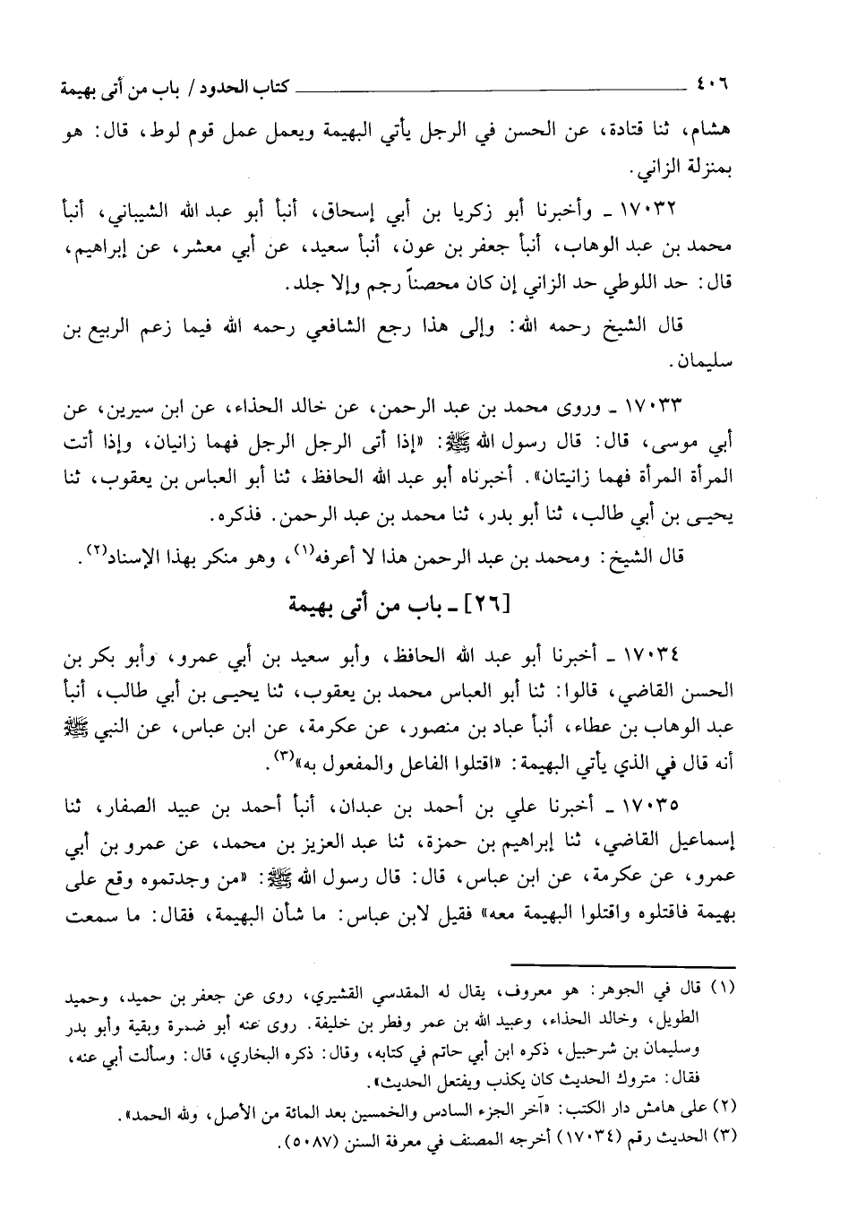 17034 - أَخْبَرَنَا أَبُو عَبْدِ اللهِ الْحَافِظُ، وَأَبُو سَعِيدِ بْنُ أَبِي عَمْرٍو، وَأَبُو بَكْرِ بْنُ الْحَسَنِ الْقَاضِي، قَالُوا: ثنا أَبُو الْعَبَّاسِ مُحَمَّدُ بْنُ يَعْقُوبَ، ثنا يَحْيَى بْنُ أَبِي طَالِبٍ، أنبأ عَبْدُ الْوَهَّابِ بْنُ عَطَاءٍ، أنبأ عَبَّادُ بْنُ مَنْصُورٍ، عَنْ عِكْرِمَةَ، عَنِ ابْنِ عَبَّاسٍ، عَنِ النَّبِيِّ صَلَّى اللهُ عَلَيْهِ وَسَلَّمَ أَنَّهُ قَالَ فِي الَّذِي يَأْتِي الْبَهِيمَةَ: §" اقْتُلُوا الْفَاعِلَ وَالْمَفْعُولَ بِهِ "