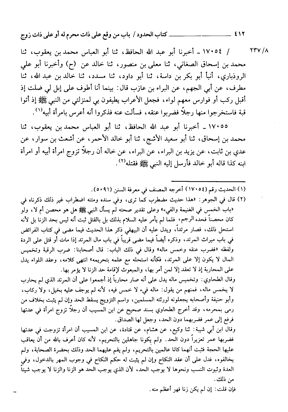 17054 - أَخْبَرَنَا أَبُو عَبْدِ اللهِ الْحَافِظُ، ثنا أَبُو الْعَبَّاسِ مُحَمَّدُ بْنُ يَعْقُوبَ، ثنا مُحَمَّدُ بْنُ إِسْحَاقَ الصَّغَانِيُّ، ثنا مُعَلَّى بْنُ مَنْصُورٍ، ثنا خَالِدٌ، عَنْ ح، وَأَخْبَرَنَا أَبُو عَلِيٍّ الرُّوذْبَارِيُّ، أنبأ أَبُو بَكْرِ بْنُ دَاسَةَ، ثنا أَبُو دَاوُدَ، ثنا مُسَدَّدٌ، ثنا خَالِدُ بْنُ عَبْدِ اللهِ، ثنا مُطَرِّفٌ، عَنْ أَبِي الْجَهْمِ، " عَنِ الْبَرَاءِ بْنِ عَازِبٍ، قَالَ: بَيْنَمَا أَنَا أَطُوفُ، عَلَى إِبِلٍ لِي ضَلَّتْ، إِذْ أَقْبَلَ رَكْبٌ أَوْ فَوَارِسُ مَعَهُمْ لِوَاءٌ، فَجَعَلَ الْأَعْرَابُ يُطِيفُونَ بِي لِمَنْزِلَتِي مِنَ النَّبِيِّ صَلَّى اللهُ عَلَيْهِ وَسَلَّمَ، §إِذْ أَتَوْا قُبَّةً فَاسْتَخْرَجُوا مِنْهَا رَجُلًا فَضَرَبُوا عُنُقَهُ، فَسَأَلْتُ عَنْهُ فَذَكَرُوا أَنَّهُ أَعْرَسَ بِامْرَأَةِ أَبِيهِ