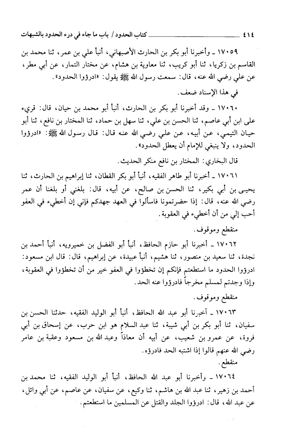 17060 - وَقَدْ أَخْبَرَنَا أَبُو بَكْرِ بْنُ الْحَارِثِ، أنبأ أَبُو مُحَمَّدِ بْنُ حَيَّانَ، قَالَ: قُرِئَ عَلَى ابْنِ أَبِي عَاصِمٍ، ثنا الْحَسَنُ بْنُ عَلِيٍّ، ثنا سَهْلُ بْنُ حَمَّادٍ، ثنا الْمُخْتَارُ بْنُ نَافِعٍ، ثنا أَبُو حَيَّانَ التَّيْمِيُّ، عَنْ أَبِيهِ، عَنْ عَلِيٍّ، رَضِيَ اللهُ عَنْهُ، قَالَ: قَالَ رَسُولُ اللهِ صَلَّى اللهُ عَلَيْهِ وَسَلَّمَ: " §ادْرَءُوا الْحُدُودَ، وَلَا يَنْبَغِي لِلْإِمَامِ أَنْ يُعَطِّلَ الْحُدُودَ " قَالَ الْبُخَارِيُّ: الْمُخْتَارُ بْنُ نَافِعٍ مُنْكَرُ الْحَدِيثِ