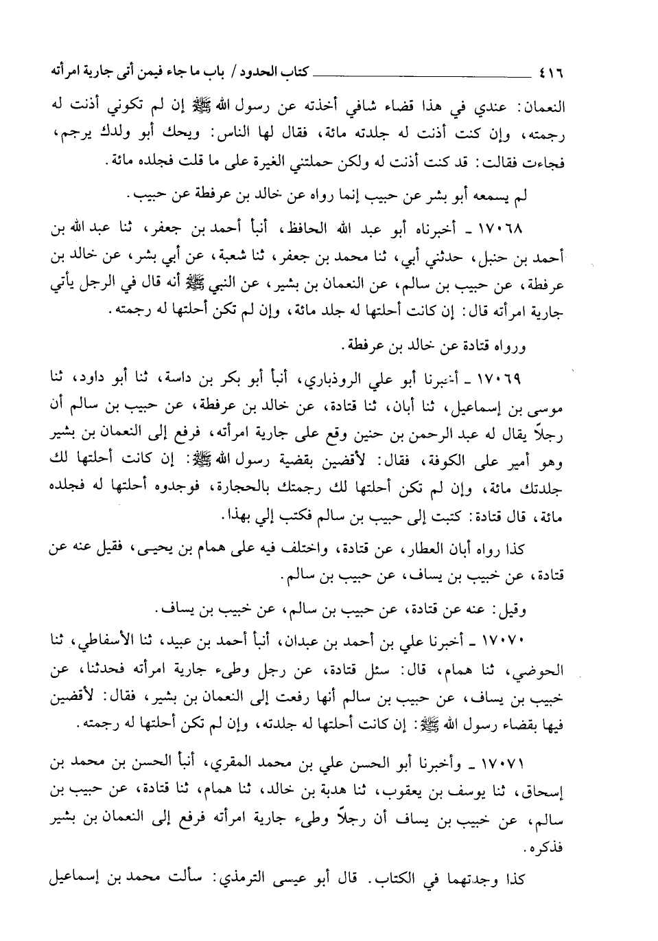 17071 - وَأَخْبَرَنَا أَبُو الْحَسَنِ عَلِيُّ بْنُ مُحَمَّدٍ الْمُقْرِئُ، أنبأ الْحَسَنُ بْنُ مُحَمَّدِ بْنِ إِسْحَاقَ، ثنا يُوسُفُ بْنُ يَعْقُوبَ، ثنا هُدْبَةُ بْنُ خَالِدٍ، ثنا هَمَّامٌ، ثنا قَتَادَةُ، عَنْ حَبِيبِ بْنِ سَالِمٍ، عَنْ خُبَيْبِ بْنِ يَسَافٍ أَنَّ رَجُلًا وَطِئَ جَارِيَةَ امْرَأَتِهِ فَرُفِعَ إِلَى النُّعْمَانِ بْنِ بَشِيرٍ، فَذَكَرَهُ كَذَا وَجَدْتُهُمَا فِي الْكِتَابِ قَالَ أَبُو عِيسَى التِّرْمِذِيُّ: سَأَلْتُ مُحَمَّدَ بْنَ إِسْمَاعِيلَ -[417]- الْبُخَارِيَّ عَنْ هَذَا الْحَدِيثِ، فَقَالَ: أَنَا أَتَّقِي هَذَا الْحَدِيثَ، وَإِنَّمَا رَوَاهُ قَتَادَةُ، عَنْ خَالِدِ بْنِ عُرْفُطَةَ، عَنْ حَبِيبِ بْنِ سَالِمٍ، عَنِ النُّعْمَانِ قَالَ: وَيُرْوَى عَنْ قَتَادَةَ أَنَّهُ، قَالَ: كَتَبَ إِلِيَّ حَبِيبُ بْنُ سَالِمٍ قَالَ: وَرَوَاهُ أَبُو بِشْرٍ، عَنْ خَالِدِ بْنِ عُرْفُطَةَ أَيْضًا، عَنْ حَبِيبِ بْنِ سَالِمٍ قُلْتُ: وَلَمْ يَذْكُرْ رِوَايَةَ هَمَّامٍ وَقَدْ رُوِيَ فِي ذَلِكَ حَدِيثٌ آخَرُ أَضْعَفُ مِنْ هَذَا