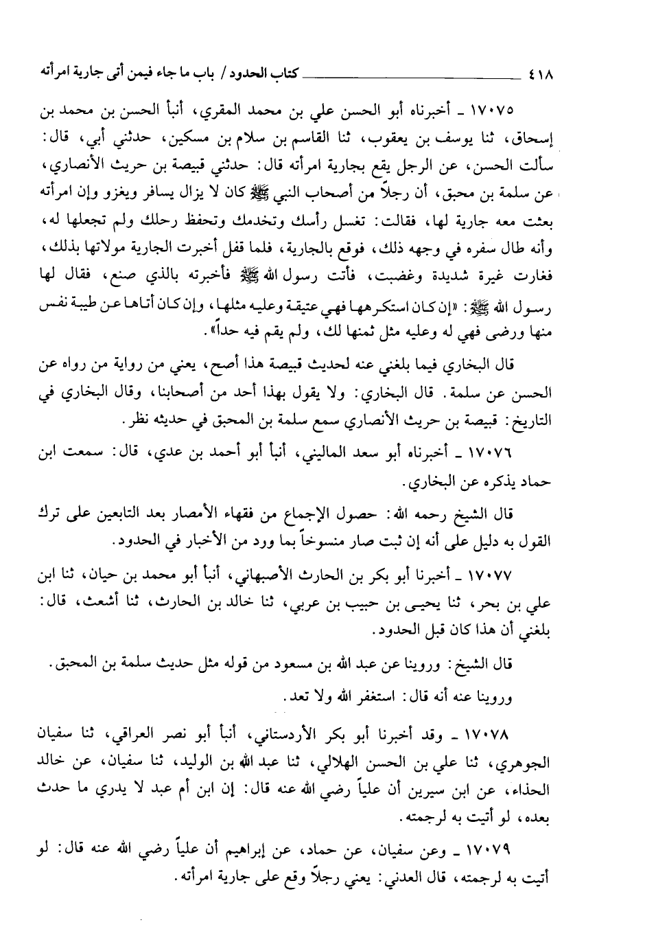 17077 - أَخْبَرَنَا أَبُو بَكْرِ بْنُ الْحَارِثِ الْأَصْبَهَانِيُّ، أنبأ أَبُو مُحَمَّدِ بْنُ حَيَّانَ، ثنا ابْنُ عَلِيِّ بْنِ بَحْرٍ، ثنا يَحْيَى بْنُ حَبِيبِ بْنِ عَرَبِيٍّ، ثنا خَالِدُ بْنُ الْحَارِثِ، ثنا أَشْعَثُ، قَالَ: " §بَلَغَنِي أَنَّ هَذَا، كَانَ قَبْلَ الْحُدُودِ " قَالَ الشَّيْخُ: وَرُوِّينَا عَنْ عَبْدِ اللهِ بْنِ مَسْعُودٍ مِنْ قَوْلِهِ مِثْلَ حَدِيثِ سَلَمَةَ بْنِ الْمُحَبِّقِ وَرُوِّينَا عَنْهُ أَنَّهُ قَالَ: اسْتَغْفِرِ اللهَ وَلَا تَعُدْ