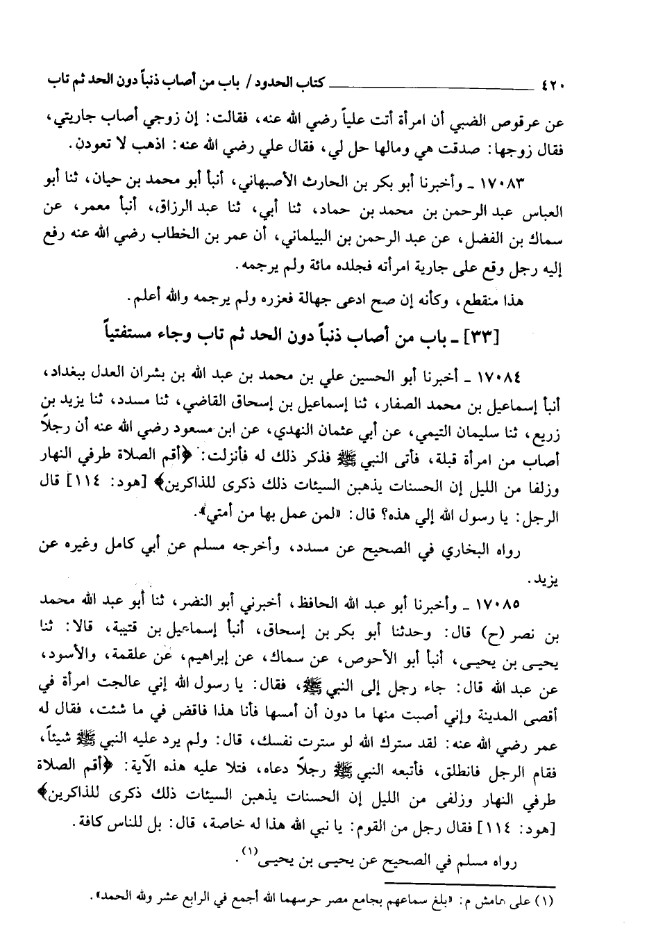 17084 - أَخْبَرَنَا أَبُو الْحُسَيْنِ عَلِيُّ بْنُ مُحَمَّدِ بْنِ عَبْدِ اللهِ بْنِ بِشْرَانَ الْعَدْلُ بِبَغْدَادَ، أنبأ إِسْمَاعِيلُ بْنُ مُحَمَّدٍ الصَّفَّارُ، ثنا إِسْمَاعِيلُ بْنُ إِسْحَاقَ الْقَاضِي، ثنا مُسَدَّدٌ، ثنا يَزِيدُ بْنُ زُرَيْعٍ، ثنا سُلَيْمَانُ التَّيْمِيُّ، عَنْ أَبِي عُثْمَانَ النَّهْدِيِّ، عَنِ ابْنِ مَسْعُودٍ، رَضِيَ اللهُ عَنْهُ، أَنَّ رَجُلًا أَصَابَ مِنِ امْرَأَةٍ قُبْلَةً فَأَتَى النَّبِيَّ صَلَّى اللهُ عَلَيْهِ وَسَلَّمَ فَذَكَرَ ذَلِكَ لَهُ فَأُنْزِلَتْ: {§أَقِمِ الصَّلَاةَ طَرَفَيِ النَّهَارِ وَزُلَفًا مِنَ اللَّيْلِ إِنَّ الْحَسَنَاتِ يُذْهِبْنَ السَّيِّئَاتِ ذَلِكَ ذِكْرَى لِلذَّاكِرِينَ} [هود: 114]، قَالَ الرَّجُلُ: يَا رَسُولَ اللهِ إِلِيَّ هَذِهِ؟ قَالَ: " لِمَنْ عَمِلَ بِهَا مِنْ أُمَّتِي " رَوَاهُ الْبُخَارِيُّ فِي الصَّحِيحِ عَنْ مُسَدَّدٍ، وَأَخْرَجَهُ مُسْلِمٌ عَنْ أَبِي كَامِلٍ وَغَيْرِهِ، عَنْ يَزِيدَ