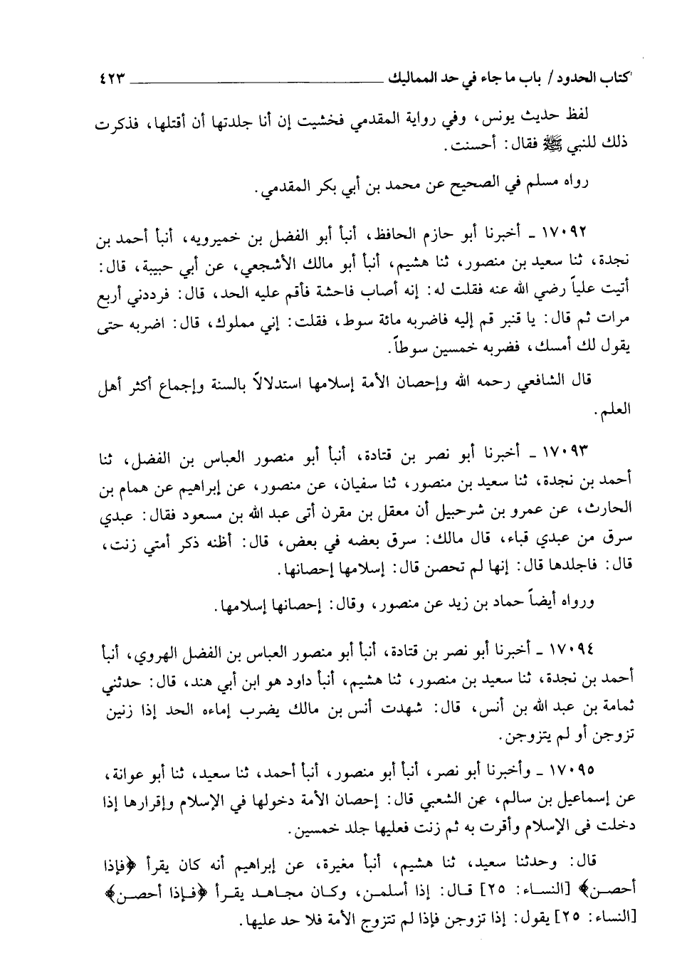 17093 - أَخْبَرَنَا أَبُو نَصْرِ بْنُ قَتَادَةَ، أنبأ أَبُو مَنْصُورٍ الْعَبَّاسُ بْنُ الْفَضْلِ، ثنا أَحْمَدُ بْنُ نَجْدَةَ، ثنا سَعِيدُ بْنُ مَنْصُورٍ، ثنا سُفْيَانُ، عَنْ مَنْصُورٍ، عَنْ إِبْرَاهِيمَ، عَنْ هَمَّامِ بْنِ الْحَارِثِ، عَنْ عَمْرِو بْنِ شُرَحْبِيلَ، " أَنَّ مَعْقِلَ بْنَ مُقَرِّنٍ، أَتَى عَبْدَ اللهِ بْنَ مَسْعُودٍ فَقَالَ: عَبْدِي سَرَقَ مِنْ عَبْدِي قَبَاءً، قَالَ: مَالِكَ سُرِقَ بَعْضُهُ فِي بَعْضٍ، قَالَ: أَظُنُّهُ ذَكَرَ أَمَتِي زَنَتْ، قَالَ: فَاجْلِدْهَا، قَالَ: إِنَّهَا لَمْ تُحْصَنْ، قَالَ: §إِسْلَامُهَا إِحْصَانُهَا " وَرَوَاهُ أَيْضًا حَمَّادُ بْنُ زَيْدٍ عَنْ مَنْصُورٍ، وَقَالَ: إِحْصَانُهَا إِسْلَامُهَا