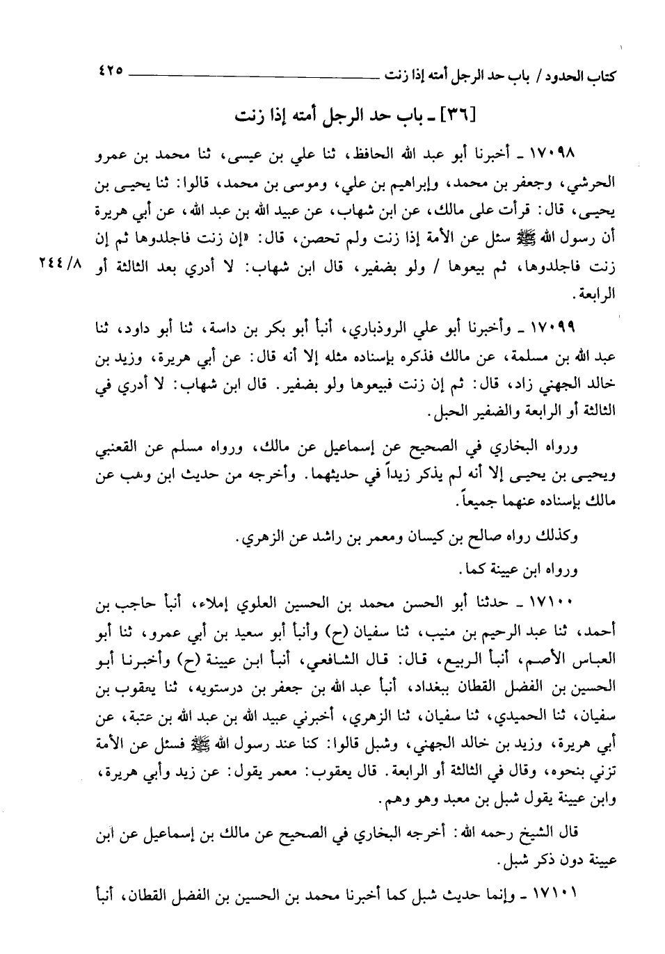 17098 - أَخْبَرَنَا أَبُو عَبْدِ اللهِ الْحَافِظُ، ثنا عَلِيُّ بْنُ عِيسَى، ثنا مُحَمَّدُ بْنُ عَمْرٍو الْحَرَشِيُّ، وَجَعْفَرُ بْنُ مُحَمَّدٍ، وَإِبْرَاهِيمُ بْنُ عَلِيٍّ، وَمُوسَى بْنُ مُحَمَّدٍ، قَالُوا: ثنا يَحْيَى بْنُ يَحْيَى، قَالَ: قَرَأْتُ عَلَى مَالِكٍ، عَنِ ابْنِ شِهَابٍ، عَنْ عُبَيْدِ اللهِ بْنِ عَبْدِ اللهِ، عَنْ أَبِي هُرَيْرَةَ، أَنَّ رَسُولَ اللهِ صَلَّى اللهُ عَلَيْهِ وَسَلَّمَ سُئِلَ عَنِ الْأَمَةِ إِذَا زَنَتْ وَلَمْ تُحْصَنْ، قَالَ: " §إِنْ زَنَتْ فَاجْلِدُوهَا، ثُمَّ إِنْ زَنَتْ فَاجْلِدُوهَا، ثُمَّ بِيعُوهَا وَلَوْ بِضَفِيرٍ " قَالَ ابْنُ شِهَابٍ: لَا أَدْرِي أبَعْدَ الثَّالِثَةِ أَوِ الرَّابِعَةِ