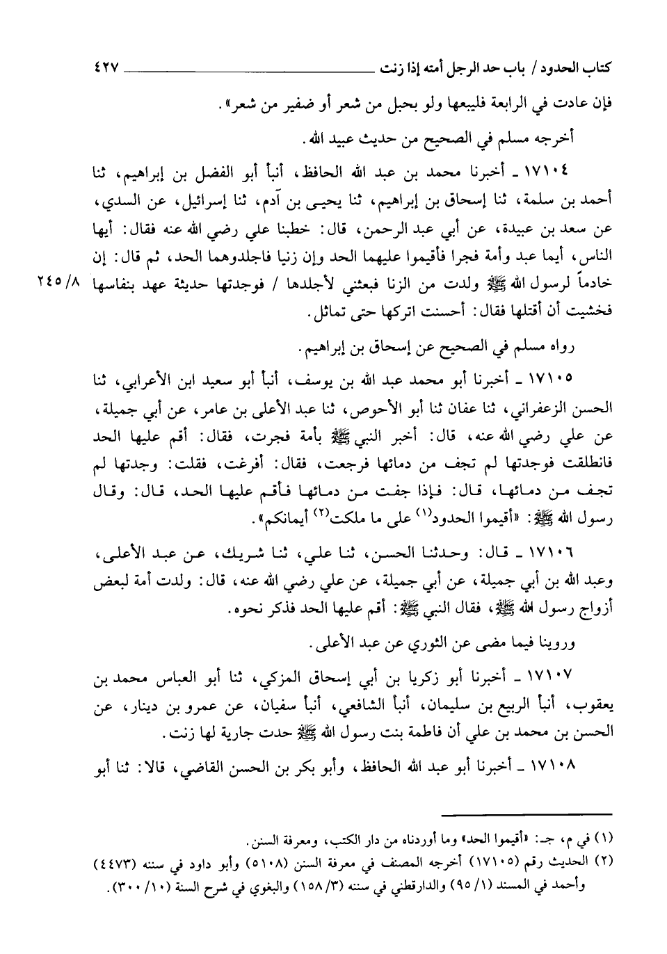 17104 - أَخْبَرَنَا مُحَمَّدُ بْنُ عَبْدِ اللهِ الْحَافِظُ، أنبأ أَبُو الْفَضْلِ بْنُ إِبْرَاهِيمَ، ثنا أَحْمَدُ بْنُ سَلَمَةَ، ثنا إِسْحَاقُ بْنُ إِبْرَاهِيمَ، ثنا يَحْيَى بْنُ آدَمَ، ثنا إِسْرَائِيلُ، عَنِ السُّدِّيِّ، عَنْ سَعْدِ بْنِ عُبَيْدَةَ، عَنْ أَبِي عَبْدِ الرَّحْمَنِ قَالَ: خَطَبَنَا عَلِيٌّ رَضِيَ اللهُ عَنْهُ فَقَالَ: أَيُّهَا النَّاسُ أَيُّمَا عَبْدٍ وَأَمَةٍ فَجَرَا فَأَقِيمُوا عَلَيْهِمَا الْحَدَّ، وَإِنْ زَنَيَا فَاجْلُدُوهُمَا الْحَدَّ، ثُمَّ قَالَ: إِنَّ خَادِمًا لِرَسُولِ اللهِ صَلَّى اللهُ عَلَيْهِ وَسَلَّمَ وَلَدَتْ مِنَ الزِّنَا فَبَعَثَنِي لِأَجْلِدَهَا فَوَجَدْتُهَا حَدِيثَةَ عَهْدٍ بِنِفَاسِهَا، فَخَشِيتُ أَنْ أَقْتُلَهَا، فَقَالَ: " §أَحْسَنْتَ، اتْرُكْهَا حَتَّى تَمَاثَلَ " رَوَاهُ مُسْلِمٌ فِي الصَّحِيحِ عَنْ إِسْحَاقَ بْنِ إِبْرَاهِيمَ