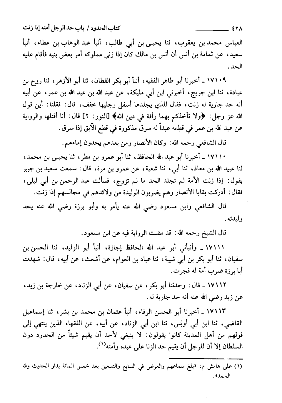 17113 - أَخْبَرَنَا أَبُو الْحَسَنِ الرَّفَّاءُ، أنبأ عُثْمَانُ بْنُ مُحَمَّدِ بْنِ بِشْرٍ، ثنا إِسْمَاعِيلُ الْقَاضِي، ثنا ابْنُ أَبِي أُوَيْسٍ، ثنا ابْنُ أَبِي الزِّنَادِ، عَنْ أَبِيهِ، عَنِ الْفُقَهَاءِ الَّذِينَ يَنْتَهِي إِلَى قَوْلِهِمْ مِنْ أَهْلِ الْمَدِينَةِ، كَانُوا يَقُولُونَ: §" لَا يَنْبَغِي لِأَحَدٍ أَنْ يُقِيمَ شَيْئًا مِنَ الْحُدُودِ دُونَ السُّلْطَانِ إِلَّا أَنَّ لِلرَّجُلِ أَنْ يُقِيمَ حَدَّ الزِّنَا عَلَى عَبْدِهِ وَأَمَتِهِ "