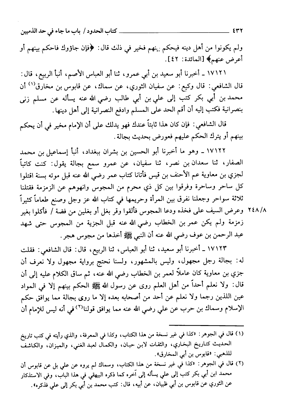 17121 - أَخْبَرَنَا أَبُو سَعِيدِ بْنُ أَبِي عَمْرٍو، ثنا أَبُو الْعَبَّاسِ الْأَصَمُّ، أنبأ الرَّبِيعُ، قَالَ: قَالَ الشَّافِعِيُّ: قَالَ وَكِيعٌ: عَنْ سُفْيَانَ الثَّوْرِيِّ، عَنْ سِمَاكٍ، عَنْ قَابُوسِ بْنِ مُخَارِقٍ، أَنَّ مُحَمَّدَ بْنَ أَبِي بَكْرٍ، كَتَبَ إِلَى عَلِيِّ بْنِ أَبِي طَالِبٍ رَضِيَ اللهُ عَنْهُ يَسْأَلُهُ عَنْ مُسْلِمٍ، زَنَى بِنَصْرَانِيَّةٍ، فَكَتَبَ إِلَيْهِ: أَنْ §أَقِمِ الْحَدَّ، عَلَى الْمُسْلِمِ، وَادْفَعِ النَّصْرَانِيَّةَ إِلَى أَهْلِ دِينِهَا قَالَ الشَّافِعِيُّ: فَإِنْ كَانَ هَذَا ثَابِتًا عِنْدَكَ فَهُوَ يَدُلُّكَ عَلَى أَنَّ الْإِمَامَ مُخَيَّرٌ فِي أَنْ يَحْكُمَ بَيْنَهُمْ أَوْ يَتْرُكَ الْحُكْمَ عَلَيْهِمْ، فَعُورِضَ بِحَدِيثِ بَجَالَةَ