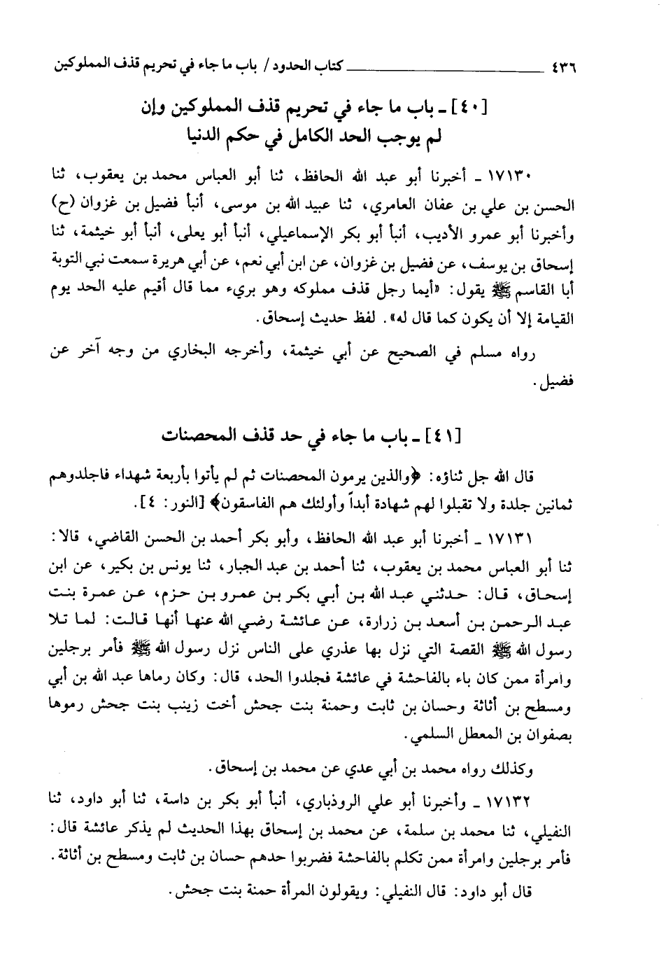 17132 - وَأَخْبَرَنَا أَبُو عَلِيٍّ الرُّوذْبَارِيُّ، أنبأ أَبُو بَكْرِ بْنُ دَاسَةَ، ثنا أَبُو دَاوُدَ، ثنا النُّفَيْلِيُّ، ثنا مُحَمَّدُ بْنُ سَلَمَةَ، عَنْ مُحَمَّدِ بْنِ إِسْحَاقَ، بِهَذَا الْحَدِيثِ، لَمْ يَذْكُرْ عَائِشَةَ، قَالَ: فَأَمَرَ بِرَجُلَيْنِ وَامْرَأَةٍ مِمَّنْ تَكَلَّمَ بِالْفَاحِشَةِ فَضُرِبُوا حَدَّهُمْ: حَسَّانِ بْنِ ثَابِتٍ، وَمِسْطَحِ بْنِ أُثَاثَةَ قَالَ أَبُو دَاوُدَ: قَالَ النُّفَيْلِيُّ: وَيَقُولُونَ الْمَرْأَةُ حَمْنَةُ بِنْتُ جَحْشٍ