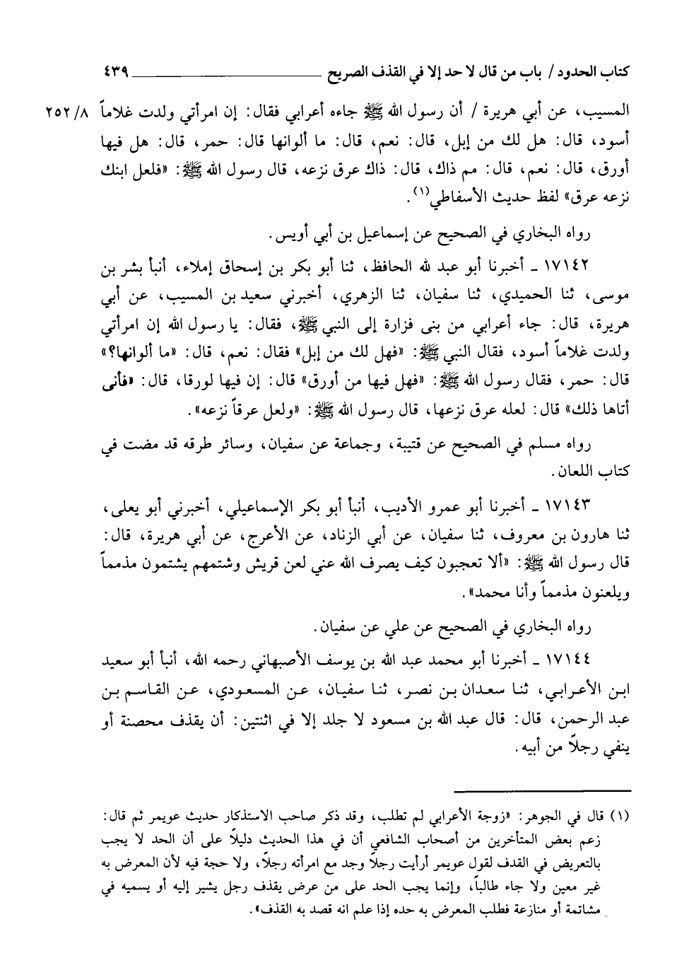 17142 - أَخْبَرَنَا أَبُو عَبْدِ اللهِ الْحَافِظُ، ثنا أَبُو بَكْرِ بْنُ إِسْحَاقَ إِمْلَاءً، أنبأ بِشْرُ بْنُ مُوسَى، ثنا الْحُمَيْدِيُّ، ثنا سُفْيَانُ، ثنا الزُّهْرِيُّ، أَخْبَرَنِي سَعِيدُ بْنُ الْمُسَيِّبِ، عَنْ أَبِي هُرَيْرَةَ، قَالَ: جَاءَ أَعْرَابِيٌّ مِنْ بَنِي فَزَارَةَ إِلَى النَّبِيِّ صَلَّى اللهُ عَلَيْهِ وَسَلَّمَ، فَقَالَ: يَا رَسُولَ اللهِ إِنَّ امْرَأَتِي وَلَدَتْ غُلَامًا أَسْوَدَ، فَقَالَ النَّبِيُّ صَلَّى اللهُ عَلَيْهِ وَسَلَّمَ: " فَهَلْ لَكَ مِنْ إِبِلٍ؟ " فَقَالَ: نَعَمْ، قَالَ: " مَا أَلْوَانُهَا؟ " قَالَ: حُمْرٌ، فَقَالَ رَسُولُ اللهِ صَلَّى اللهُ عَلَيْهِ وَسَلَّمَ: " فَهَلْ فِيهَا مِنْ أَوْرَقَ؟ " قَالَ: إِنَّ فِيهَا لَوُرْقًا، قَالَ: " فَأَنَّى أَتَاهَا ذَلِكَ؟ " قَالَ: لَعَلَّهُ عِرْقٌ نَزَعَهَا، قَالَ رَسُولُ اللهِ صَلَّى اللهُ عَلَيْهِ وَسَلَّمَ: §" وَلَعَلَّ عِرْقًا نَزَعَهُ " رَوَاهُ مُسْلِمٌ فِي الصَّحِيحِ عَنْ قُتَيْبَةَ وَجَمَاعَةٍ، عَنْ سُفْيَانَ، وَسَائِرُ طُرُقِهِ قَدْ مضتْ فِي كِتَابِ اللِّعَانِ