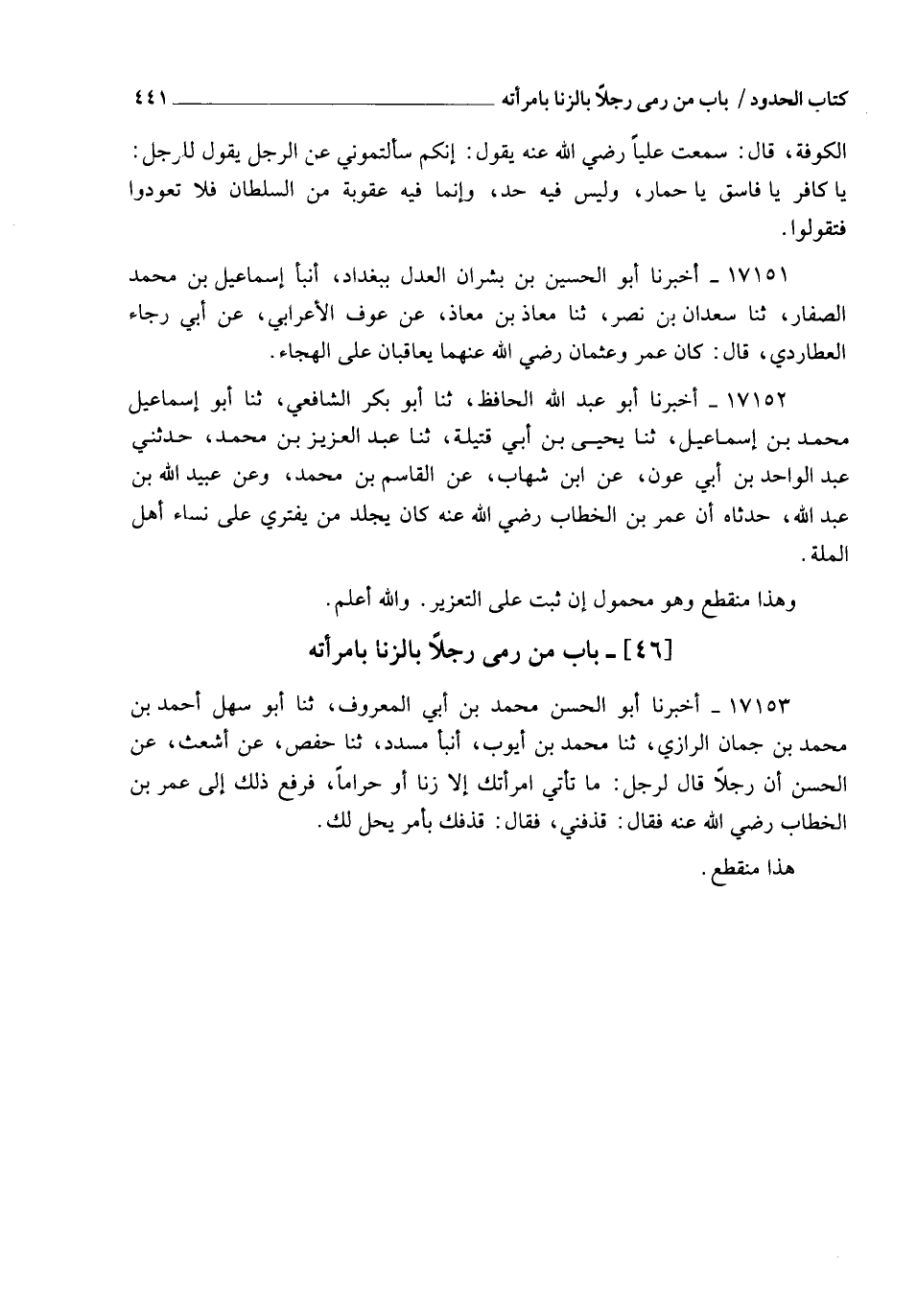 17152 - أَخْبَرَنَا أَبُو عَبْدِ اللهِ الْحَافِظُ، ثنا أَبُو بَكْرٍ الشَّافِعِيُّ، ثنا أَبُو إِسْمَاعِيلَ مُحَمَّدُ بْنُ إِسْمَاعِيلَ، ثنا يَحْيَى بْنُ أَبِي قُتَيْلَةَ، ثنا عَبْدُ الْعَزِيزِ بْنُ مُحَمَّدٍ، حَدَّثَنِي عَبْدُ الْوَاحِدِ بْنُ أَبِي عَوْنٍ، عَنِ ابْنِ شِهَابٍ، عَنِ الْقَاسِمِ بْنِ مُحَمَّدٍ، وَعَنْ عُبَيْدِ اللهِ بْنِ عَبْدِ اللهِ، حَدَّثَاهُ أَنَّ عُمَرَ بْنَ الْخَطَّابِ رَضِيَ اللهُ عَنْهُ §" كَانَ يَجْلِدُ مَنْ يَفْتَرِي عَلَى نِسَاءِ أَهْلِ الْمِلَّةِ " وَهَذَا مُنْقَطِعٌ، وَهُوَ مَحْمُولٌ إِنْ ثَبَتَ عَلَى التَّعْزِيرِ، وَاللهُ أَعْلَمُ