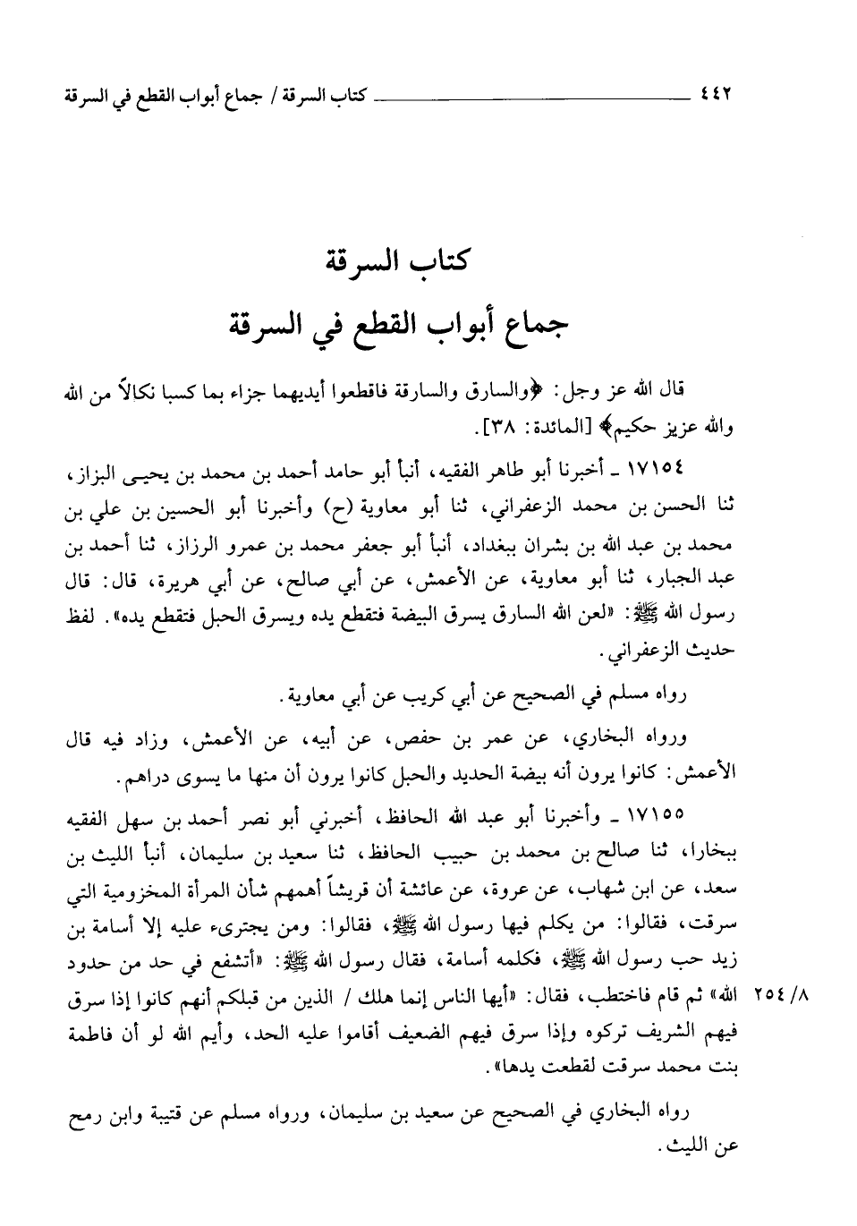 17155 - وَأَخْبَرَنَا أَبُو عَبْدِ اللهِ الْحَافِظُ، أَخْبَرَنِي أَبُو نَصْرٍ أَحْمَدُ بْنُ سَهْلٍ الْفَقِيهُ بِبُخَارَى، ثنا صَالِحُ بْنُ مُحَمَّدِ بْنِ حَبِيبٍ الْحَافِظُ، ثنا سَعِيدُ بْنُ سُلَيْمَانَ، أنبأ اللَّيْثُ بْنُ سَعْدٍ، عَنِ ابْنِ شِهَابٍ، عَنْ عُرْوَةَ، عَنْ عَائِشَةَ أَنَّ قُرَيْشًا أَهَمَّهُمْ شَأْنُ الْمَرْأَةِ الْمَخْزُومِيَّةِ الَّتِي سَرَقَتْ، فَقَالُوا: مَنْ يُكَلِّمُ فِيهَا رَسُولَ اللهِ صَلَّى اللهُ عَلَيْهِ وَسَلَّمَ؟ فَقَالُوا: وَمَنْ يَجْتَرِئُ عَلَيْهِ إِلَّا أُسَامَةُ بْنُ زَيْدٍ حِبُّ رَسُولِ اللهِ صَلَّى اللهُ عَلَيْهِ وَسَلَّمَ؟ فَكَلَّمَهُ أُسَامَةُ فَقَالَ رَسُولُ اللهِ صَلَّى اللهُ عَلَيْهِ وَسَلَّمَ: §" أَتَشْفَعُ فِي حَدٍّ مِنْ حُدُودِ اللهِ؟ " ثُمَّ قَامَ فَاخْتَطَبَ فَقَالَ: " أَيُّهَا النَّاسُ، إِنَّمَا هَلَكَ الَّذِينَ مِنْ قَبْلِكُمْ أَنَّهُمْ كَانُوا إِذَا سَرَقَ فِيهُمُ الشَّرِيفُ تَرَكُوهُ، وَإِذَا سَرَقَ فِيهُمُ الضَّعِيفُ أَقَامُوا عَلَيْهِ الْحَدَّ، وَايْمُ اللهِ لَوْ أَنَّ فَاطِمَةَ بِنْتَ مُحَمَّدٍ سَرَقَتْ لَقَطَعْتُ يَدَهَا " رَوَاهُ الْبُخَارِيُّ فِي الصَّحِيحِ عَنْ سَعِيدِ بْنِ سُلَيْمَانَ، وَرَوَاهُ مُسْلِمٌ عَنْ قُتَيْبَةَ وَابْنِ رُمْحٍ، عَنِ اللَّيْثِ