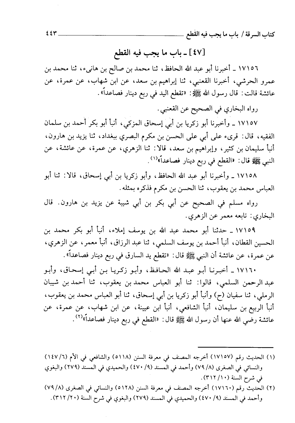 17157 - وَأَخْبَرَنَا أَبُو زَكَرِيَّا بْنُ أَبِي إِسْحَاقَ الْمُزَكِّي، أنبأ أَبُو بَكْرٍ أَحْمَدُ بْنُ سَلْمَانَ الْفَقِيهُ قَالَ: قُرِئَ عَلَى أَبِي عَلِيٍّ الْحَسَنِ بْنِ مُكْرَمٍ الْبَصْرِيِّ بِبَغْدَادَ، ثنا يَزِيدُ بْنُ هَارُونَ، أنبأ سُلَيْمَانُ بْنُ كَثِيرٍ، وَإِبْرَاهِيمُ بْنُ سَعْدٍ، قَالَا: ثنا الزُّهْرِيُّ، عَنْ عَمْرَةَ، عَنْ عَائِشَةَ، عَنِ النَّبِيِّ صَلَّى اللهُ عَلَيْهِ وَسَلَّمَ قَالَ: §" الْقَطْعُ فِي رُبْعِ دِينَارٍ فَصَاعِدًا "