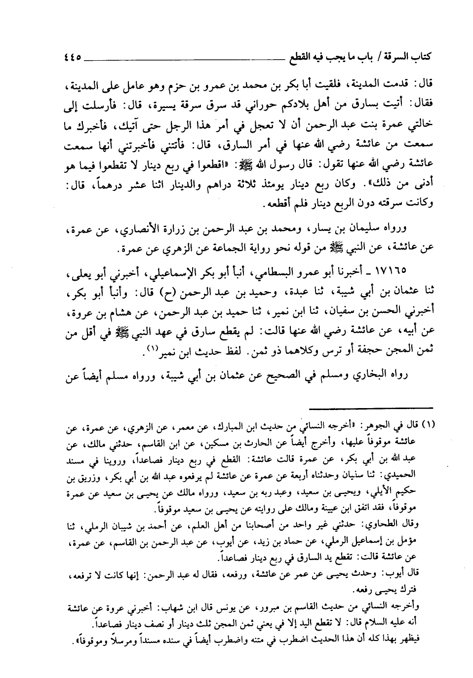 17165 - أَخْبَرَنَا أَبُو عَمْرٍو الْبِسْطَامِيُّ، أنبأ أَبُو بَكْرٍ الْإِسْمَاعِيلِيُّ، أَخْبَرَنِي أَبُو يَعْلَى، ثنا عُثْمَانُ بْنُ أَبِي شَيْبَةَ، ثنا عَبْدَةُ، وَحُمَيْدُ بْنُ عَبْدِ الرَّحْمَنِ، ح، قَالَ: وَأنبأ أَبُو بَكْرٍ أَخْبَرَنِي الْحَسَنُ بْنُ سُفْيَانَ، ثنا ابْنُ نُمَيْرٍ، ثنا حُمَيْدُ بْنُ عَبْدِ الرَّحْمَنِ، عَنْ هِشَامِ بْنِ عُرْوَةَ، عَنْ أَبِيهِ، عَنْ عَائِشَةَ، رَضِيَ اللهُ عَنْهَا قَالَتْ: §لَمْ يُقْطَعْ سَارِقٌ فِي عَهْدِ النَّبِيِّ صَلَّى اللهُ عَلَيْهِ وَسَلَّمَ فِي أَقَلِّ مِنْ ثَمَنِ الْمِجَنِّ حَجَفَةٍ أَوْ تُرْسٍ، وَكِلَاهُمَا ذُو ثَمَنٍ لَفْظُ حَدِيثِ ابْنِ نُمَيْرٍ رَوَاهُ الْبُخَارِيُّ وَمُسْلِمٌ فِي الصَّحِيحِ عَنْ عُثْمَانَ بْنِ أَبِي شَيْبَةَ، وَرَوَاهُ مُسْلِمٌ أَيْضًا عَنْ -[446]- مُحَمَّدِ بْنِ عَبْدِ اللهِ بْنِ نُمَيْرٍ، وَكَذَلِكَ رَوَاهُ عَبْدُ اللهِ بْنُ الْمُبَارَكِ وَأَبُو أُسَامَةَ فِي آخَرِينَ، عَنْ هِشَامِ بْنِ عُرْوَةَ، عَنْ أَبِيهِ، عَنْ عَائِشَةَ مَوْصُولًا، وَأَرْسَلَهُ جَمَاعَةٌ آخَرُونَ