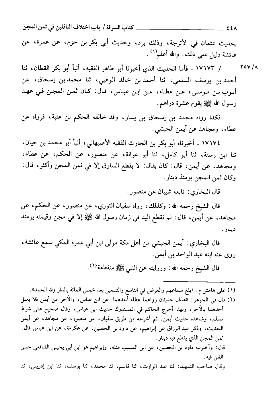 17173 - فَأَمَّا الْحَدِيثُ الَّذِي أَخْبَرَنَا أَبُو طَاهِرٍ الْفَقِيهُ، أنبأ أَبُو بَكْرٍ الْقَطَّانُ، ثنا أَحْمَدُ بْنُ يُوسُفَ السُّلَمِيُّ، ثنا أَحْمَدُ بْنُ خَالِدٍ الْوَهْبِيُّ، ثنا مُحَمَّدُ بْنُ إِسْحَاقَ، عَنْ أَيُّوبَ بْنِ مُوسَى، عَنْ عَطَاءٍ، عَنِ ابْنِ عَبَّاسٍ، قَالَ: §" كَانَ ثَمَنُ الْمِجَنِّ فِي عَهْدِ رَسُولِ اللهِ صَلَّى اللهُ عَلَيْهِ وَسَلَّمَ يُقَوَّمُ عَشَرَةَ دَرَاهِمَ "، فَكَذَا رَوَاهُ مُحَمَّدُ بْنُ إِسْحَاقَ بْنِ يَسَارٍ، وَقَدْ خَالَفَهُ الْحَكَمُ بْنُ عُتَيْبَةَ فَرَوَاهُ عَنْ عَطَاءٍ وَمُجَاهِدٍ، عَنْ أَيْمَنَ الْحَبَشِيِّ
