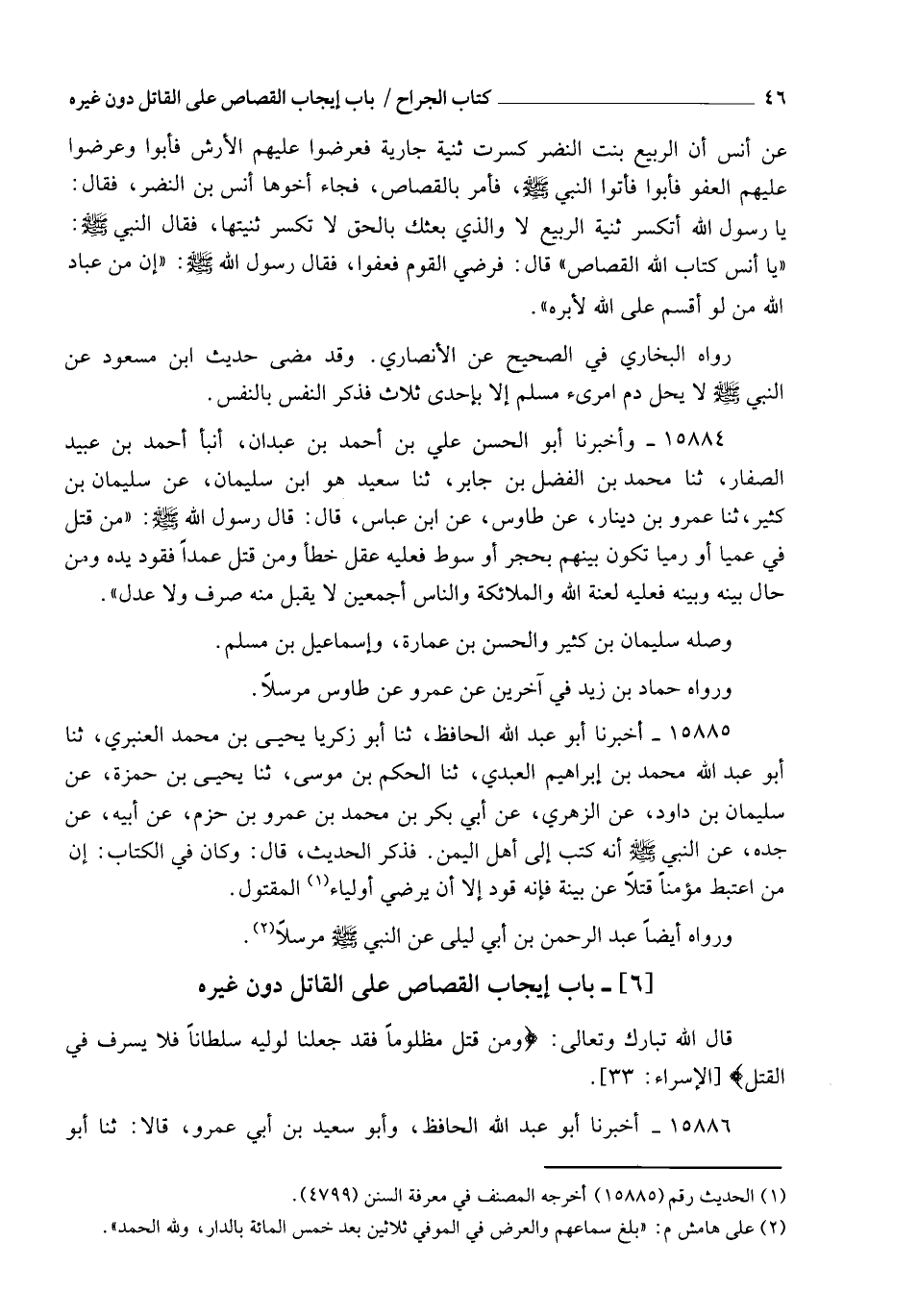 15885 - أَخْبَرَنَا أَبُو عَبْدِ اللهِ الْحَافِظُ، ثنا أَبُو زَكَرِيَّا يَحْيَى بْنُ مُحَمَّدٍ الْعَنْبَرِيُّ، ثنا أَبُو عَبْدِ اللهِ مُحَمَّدُ بْنُ إِبْرَاهِيمَ الْعَبْدِيُّ، ثنا الْحَكَمُ بْنُ مُوسَى، ثنا يَحْيَى بْنُ حَمْزَةَ، عَنْ سُلَيْمَانَ بْنِ دَاوُدَ، عَنِ الزُّهْرِيِّ، عَنْ أَبِي بَكْرِ بْنِ مُحَمَّدِ بْنِ عَمْرِو بْنِ حَزْمٍ، عَنْ أَبِيهِ، عَنْ جَدِّهِ، عَنِ النَّبِيِّ صَلَّى اللهُ عَلَيْهِ وَسَلَّمَ: أَنَّهُ كَتَبَ إِلَى أَهْلِ الْيَمَنِ. فَذَكَرَ الْحَدِيثَ، قَالَ: وَكَانَ فِي الْكِتَابِ: إِنَّ مَنِ اعْتَبَطَ مُؤْمِنًا قَتْلًا عَنْ بَيِّنَةٍ فَإِنَّهُ قَوَدٌ، إِلَّا أَنْ يَرْضَى أَوْلِيَاءُ الْمَقْتُولِ. وَرَوَاهُ أَيْضًا عَبْدُ الرَّحْمَنِ بْنُ أَبِي لَيْلَى، عَنِ النَّبِيِّ صَلَّى اللهُ عَلَيْهِ وَسَلَّمَ مُرْسَلًا