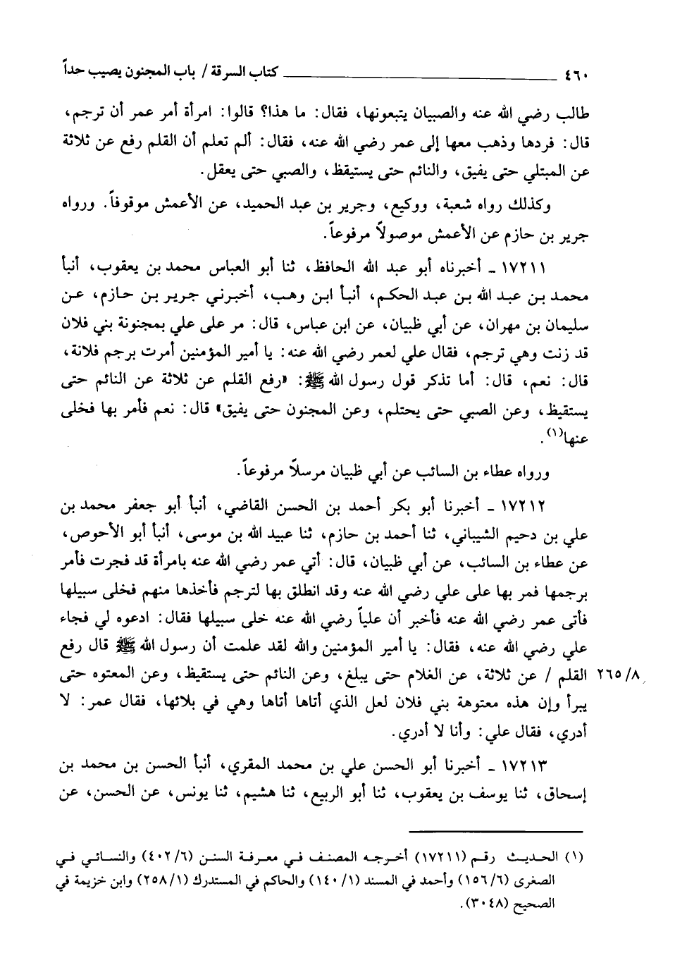 17211 - أَخْبَرَنَاهُ أَبُو عَبْدِ اللهِ الْحَافِظُ، ثنا أَبُو الْعَبَّاسِ مُحَمَّدُ بْنُ يَعْقُوبَ، أنبأ مُحَمَّدُ بْنُ عَبْدِ اللهِ بْنِ عَبْدِ الْحَكَمِ، أنبأ ابْنُ وَهْبٍ، أَخْبَرَنِي جَرِيرُ بْنُ حَازِمٍ، عَنْ سُلَيْمَانَ بْنِ مِهْرَانَ، عَنْ أَبِي ظَبْيَانَ، عَنِ ابْنِ عَبَّاسٍ، قَالَ: مُرَّ عَلَى عَلِيٍّ بِمَجْنُونَةِ بَنِي فُلَانٍ قَدْ زَنَتْ، وَهِيَ تُرْجَمُ، فَقَالَ عَلِيٌّ لِعُمَرَ رَضِيَ اللهُ عَنْهُ: يَا أَمِيرَ الْمُؤْمِنِينَ، أَمَرْتَ بِرَجْمِ فُلَانَةٍ؟ قَالَ: نَعَمْ، قَالَ: أَمَا تَذْكُرُ قَوْلَ رَسُولِ اللهِ صَلَّى اللهُ عَلَيْهِ وَسَلَّمَ: " §رُفِعَ الْقَلَمُ عَنْ ثَلَاثَةٍ: عَنِ النَّائِمِ حَتَّى يَسْتَيْقِظَ، وَعَنِ الصَّبِيِّ حَتَّى يَحْتَلِمَ، وَعَنِ الْمَجْنُونِ حَتَّى يُفِيقَ "؟ قَالَ: نَعَمْ، فَأَمَرَ بِهَا فَخَلَّى عَنْهَا وَرَوَاهُ عَطَاءُ بْنُ السَّائِبِ، عَنْ أَبِي ظَبْيَانَ مُرْسَلًا مَرْفُوعًا