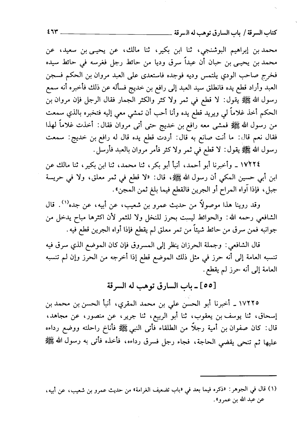 17224 - وَأَخْبَرَنَا أَبُو أَحْمَدَ، أنبأ أَبُو بَكْرٍ، ثنا مُحَمَّدٌ، ثنا ابْنُ بُكَيْرٍ، ثنا مَالِكٌ، عَنِ ابْنِ أَبِي حُسَيْنٍ الْمَكِّيِّ، أَنَّ رَسُولَ اللهِ صَلَّى اللهُ عَلَيْهِ وَسَلَّمَ قَالَ: " §لَا قَطْعَ فِي ثَمَرٍ مُعَلَّقٍ، وَلَا فِي حَرِيسَةِ جَبَلٍ، فَإِذَا آوَاهُ الْمُرَاحُ أَوِ الْجَرِينُ فَالْقَطْعُ فِيمَا بَلَغَ ثَمَنَ الْمِجَنِّ " وَقَدْ رُوِّينَا هَذَا مَوْصُولًا مِنْ حَدِيثِ عَمْرِو بْنِ شُعَيْبٍ، عَنْ أَبِيهِ، عَنْ جَدِّهِ قَالَ الشَّافِعِيُّ رَحِمَهُ اللهُ: وَالْحَوَائِطُ لَيْسَتْ بِحِرْزٍ لِلنَّخْلِ وَلَا لِلثَّمَرِ؛ لِأَنَّ أَكْثَرَهَا مُبَاحٌ يُدْخَلُ مِنْ جَوَانِبِهِ، فَمَنْ سَرَقَ مِنْ حَائِطٍ شَيْئًا مِنْ تَمْرٍ مُعَلَّقٍ لَمْ يُقْطَعْ، فَإِذَا آوَاهُ الْجَرِينُ قُطِعَ فِيهِ قَالَ الشَّافِعِيُّ: وَجُمْلَةُ الْحِرْزَانِ يُنْظَرُ إِلَى الْمَسْرُوقِ: فَإِنْ كَانَ الْمَوْضِعَ الَّذِي سُرِقَ فِيهِ تَنْسِبُهُ الْعَامَّةُ إِلَى أَنَّهُ حِرْزٌ، فِي مِثْلِ ذَلِكَ الْمَوْضِعِ قُطِعَ إِذَا أَخْرَجَهُ مِنَ الْحِرْزِ، وَإِنْ لَمْ تَنْسِبْهُ الْعَامَّةُ إِلَى أَنَّهُ حِرْزٌ لَمْ يُقْطَعْ
