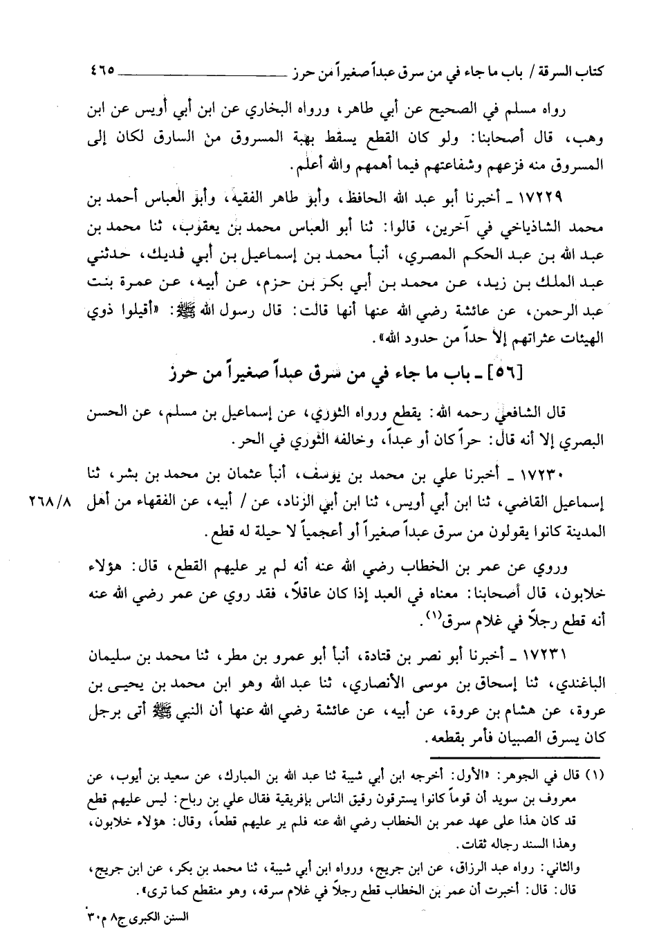 17230 - أَخْبَرَنَا عَلِيُّ بْنُ مُحَمَّدِ بْنِ يُوسُفَ، أنبأ عُثْمَانُ بْنُ مُحَمَّدِ بْنِ بِشْرٍ، ثنا إِسْمَاعِيلُ الْقَاضِي، ثنا ابْنُ أَبِي أُوَيْسٍ، ثنا ابْنُ أَبِي الزِّنَادِ، عَنْ أَبِيهِ، عَنِ الْفُقَهَاءِ، مِنْ أَهْلِ الْمَدِينَةِ كَانُوا يَقُولُونَ: " §مَنْ سَرَقَ عَبْدًا صَغِيرًا، أَوْ أَعْجَمِيًّا لَا حِيلَةَ لَهُ، قُطِعَ " وَرُوِي عَنْ عُمَرَ بْنِ الْخَطَّابِ رَضِيَ اللهُ عَنْهُ أَنَّهُ لَمْ يَرَ عَلَيْهِمُ الْقَطْعَ، قَالَ: هَؤُلَاءِ خَلَّابُونَ قَالَ أَصْحَابُنَا: مَعْنَاهُ فِي الْعَبْدِ إِذَا كَانَ عَاقِلًا، فَقَدْ رُوِيَ عَنْ عُمَرَ رَضِيَ اللهُ عَنْهُ أَنَّهُ قَطَعَ رَجُلًا فِي غُلَامٍ سُرِقَ