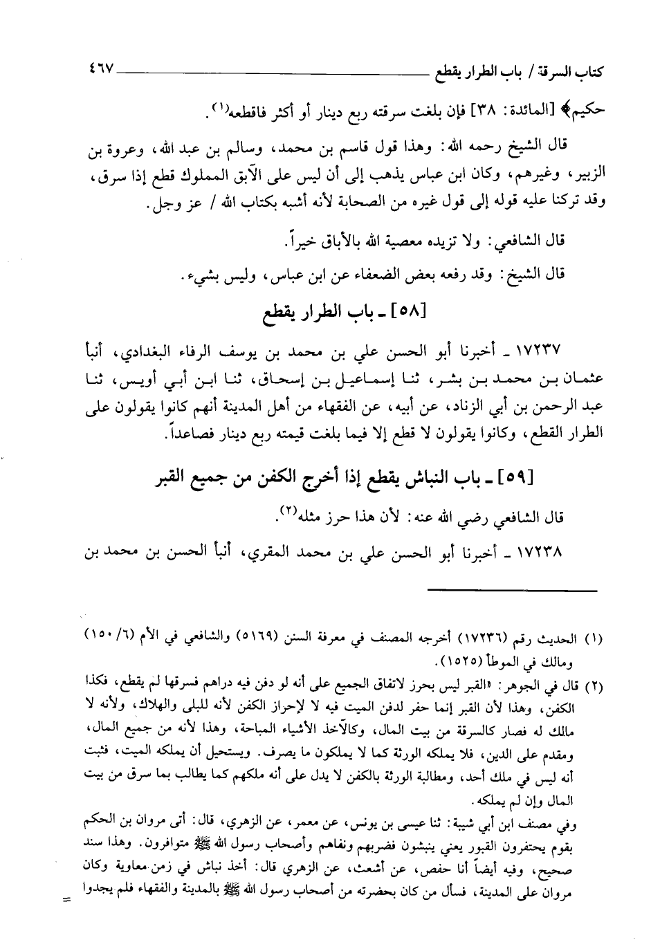 17237 - أَخْبَرَنَا أَبُو الْحَسَنِ عَلِيُّ بْنُ مُحَمَّدِ بْنِ يُوسُفَ الرَّفَّاءُ الْبَغْدَادِيُّ، أنبأ عُثْمَانُ بْنُ مُحَمَّدِ بْنِ بِشْرٍ، ثنا إِسْمَاعِيلُ بْنُ إِسْحَاقَ، ثنا ابْنُ أَبِي أُوَيْسٍ، ثنا عَبْدُ الرَّحْمَنِ بْنُ أَبِي الزِّنَادِ، عَنْ أَبِيهِ، عَنِ الْفُقَهَاءِ مِنْ أَهْلِ الْمَدِينَةِ، أَنَّهُمْ كَانُوا يَقُولُونَ: §عَلَى الطَّرَّارِ الْقَطْعُ، وَكَانُوا يَقُولُونَ: لَا قَطْعَ إِلَّا فِيمَا بَلَغَتْ قِيمَتُهُ رُبْعَ دِينَارٍ فَصَاعِدًا