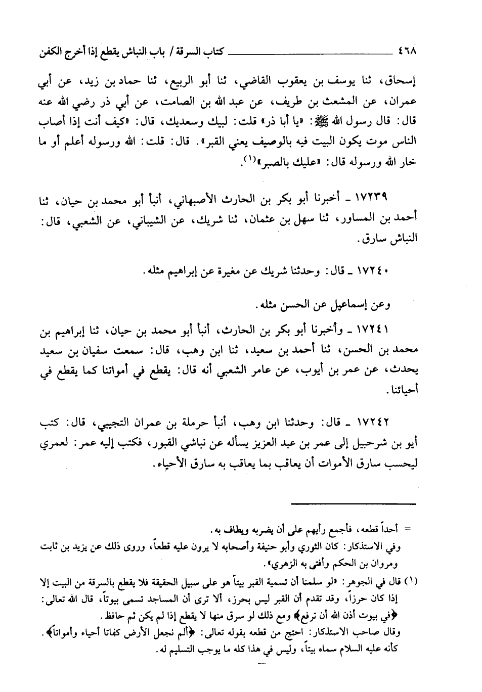 17241 - وَأَخْبَرَنَا أَبُو بَكْرِ بْنُ الْحَارِثِ، أنبأ أَبُو مُحَمَّدِ بْنُ حَيَّانَ، ثنا إِبْرَاهِيمُ بْنُ مُحَمَّدِ بْنِ الْحَسَنِ، ثنا أَحْمَدُ بْنُ سَعِيدٍ، ثنا ابْنُ وَهْبٍ، قَالَ: سَمِعْتُ سُفْيَانَ بْنَ سَعِيدٍ يُحَدِّثُ، عَنْ عُمَرَ بْنِ أَيُّوبَ، عَنْ عَامِرٍ الشَّعْبِيِّ، أَنَّهُ قَالَ: §" يُقْطَعُ فِي أَمْوَاتِنَا كَمَا يُقْطَعُ فِي أَحْيَائِنَا "